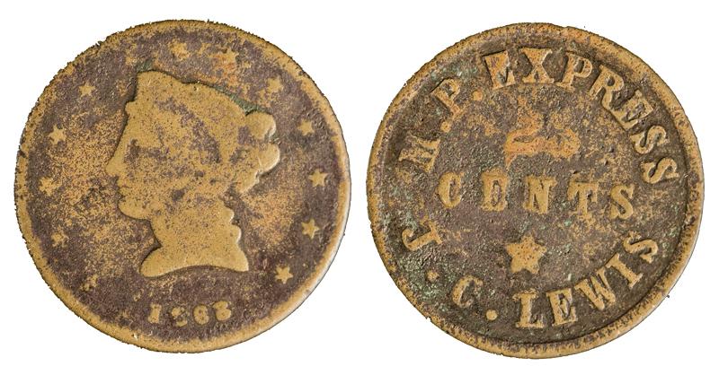Obverse: liberty facing left / 1868; Reverse: M.P. Express / 25 / cents / J.C. Lewis. 25mm, brass. Good condition.