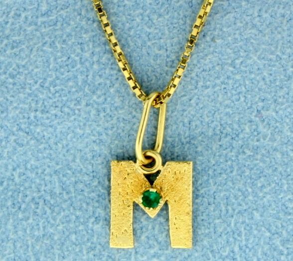 The pendant and chain are 18K yellow gold, the M contains a 2mm round emerald that has excellent color and clarity! The M is 3/8 inch long. 2.8g