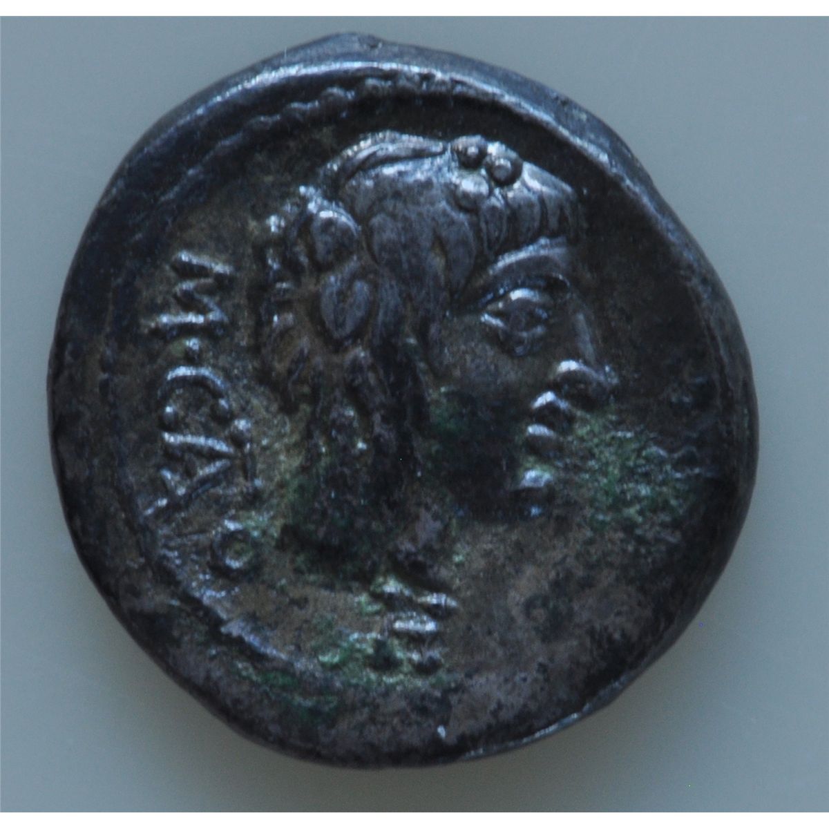 M. Porcius Cato (89 BC) - AR-Quinarius Obv: Head of young Bacchus r. with ivy M CATO behind head control letter H below head. Rev: Victory std. r. holding patera and Palm. VICTRIX in exerge, dot border. 1.9 grams S-248 Craw 743-26 VF.