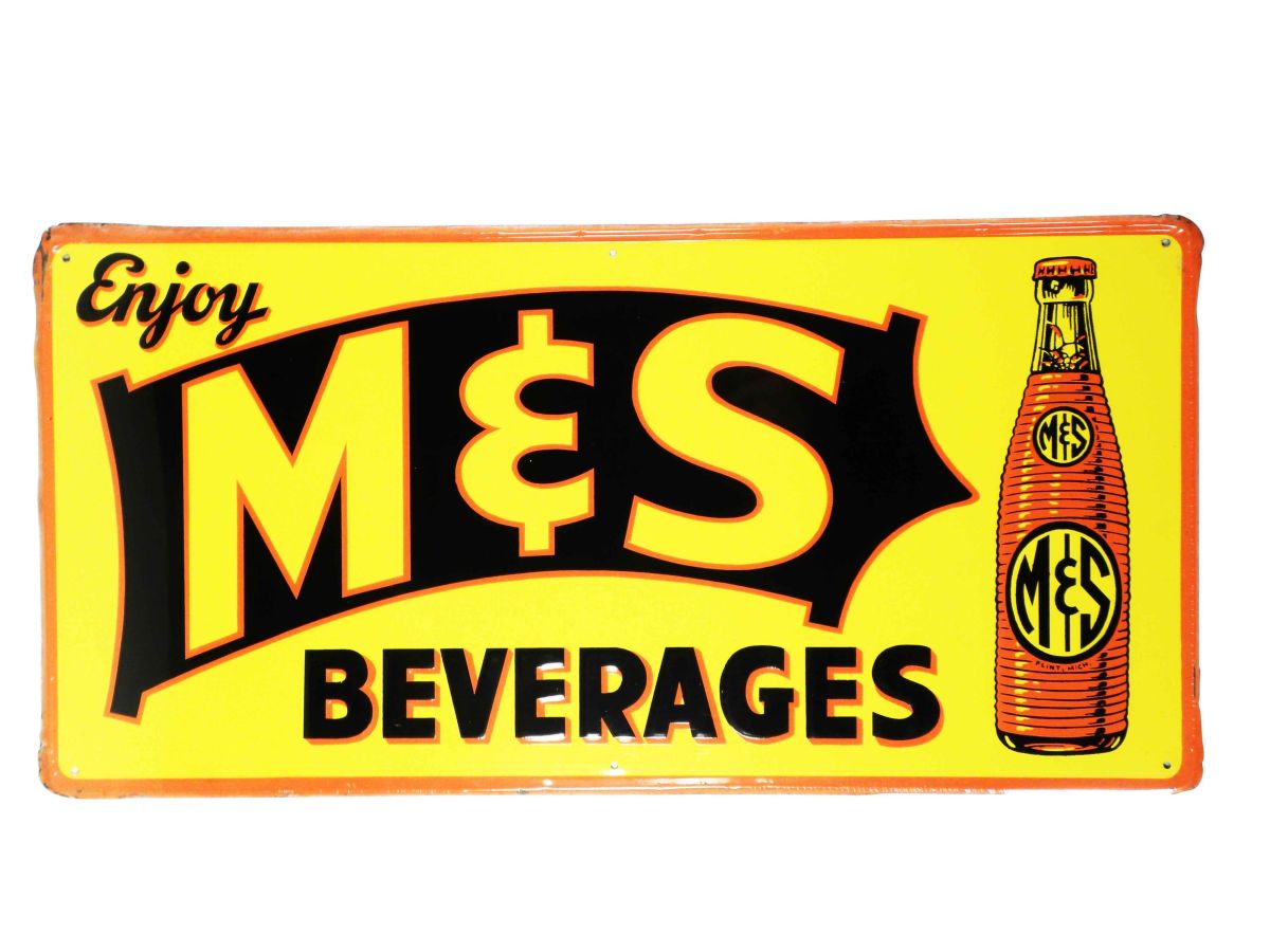 M & S Beverage Embossed Tin Sign, 1949. Some slight rust around the edges otherwise excellent condition. 24 X 12 inches.