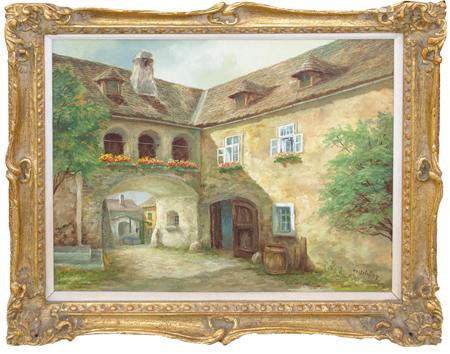 Signed original oil on canvas depicting a European courtyard. Framed. Condition: excellent. 16" x 20" (20-1/2" x 25")