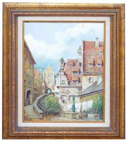 Signed original oil on canvas depicting a European courtyard. Framed. Condition: excellent. 16" x 11-1/2" (23-1/2" x 19-1/2")