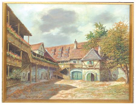 Signed original oil on canvas depicting a European courtyard. Framed. Condition: excellent. 16" x 18-1/2" (17" x 19-1/2")