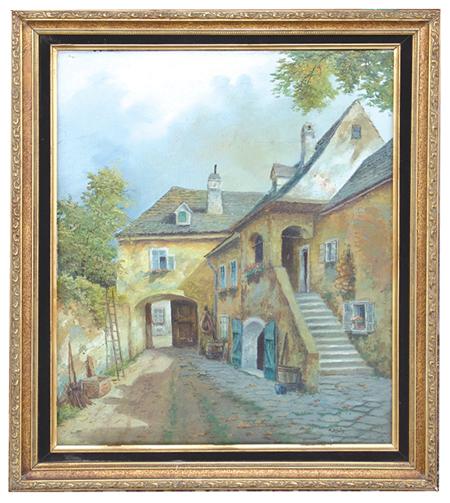 Signed original oil on canvas depicting a European courtyard. Framed. Condition: excellent. 20" x 16" (24" x 20")