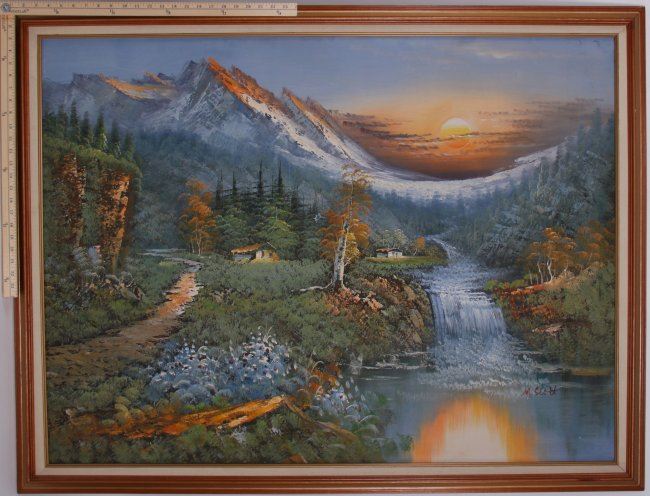 M. Scott, large oil on canvas framed painting. Condition Report: small thinned canvas in center, see back side where tape has been applied. (Size: See second photo for measurement.) Photos are part of the description representing the condition report. Pangaea Auctions urges Bidder's to view all attached photos.