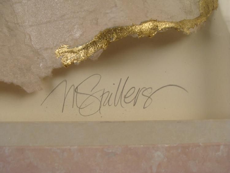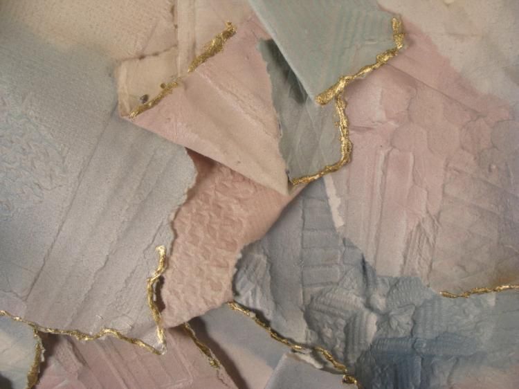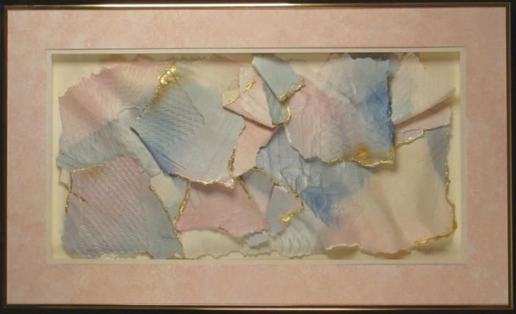 This large artwork is composed of carefully folded pieces of hand made paper, embossed with various patterns, some trimmed in gold painted edges. It creates a soft and welcoming feel for any room. Artist: M. Stillers Medium: Hand made paperFraming: Double matted in white and pink in deep set gold tone metal frameFrame size: 30 1/2 x 50 inchesCondition: Excellent