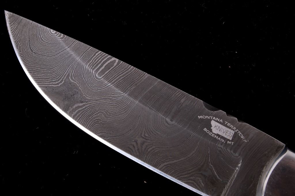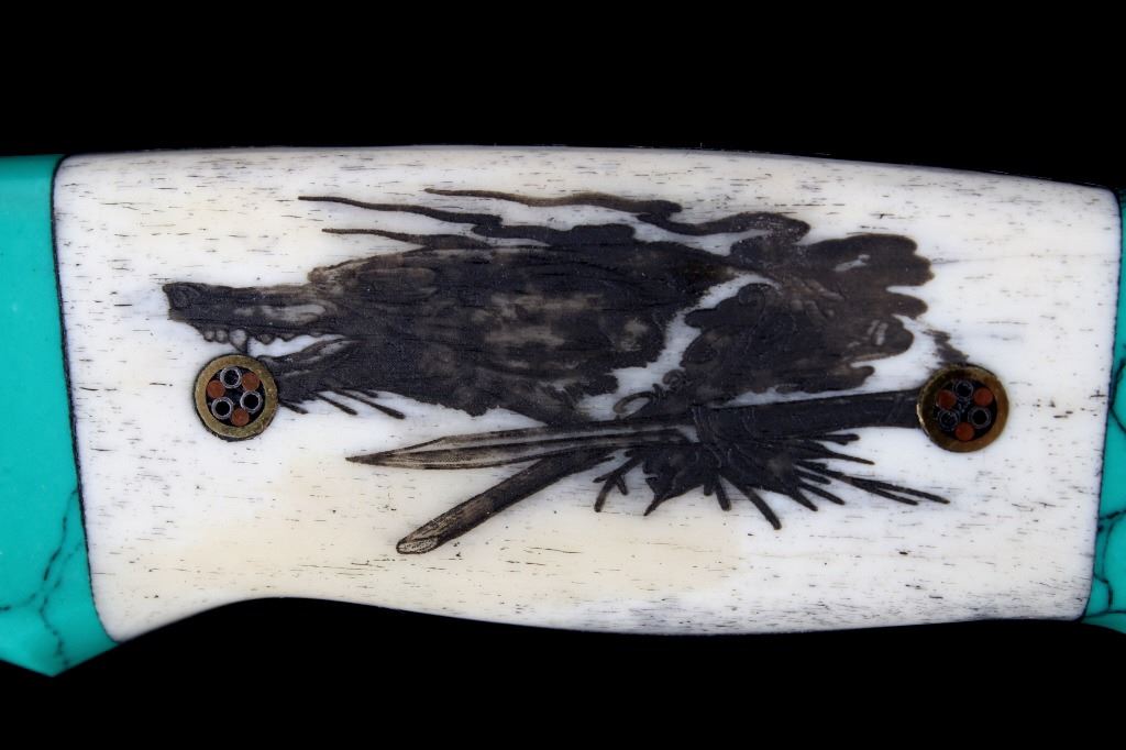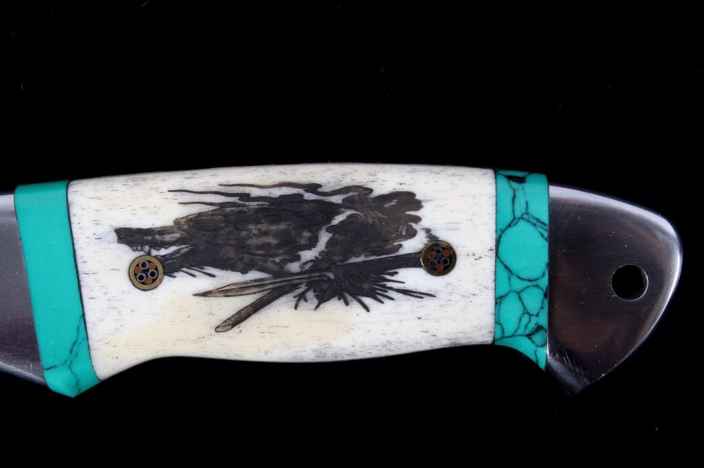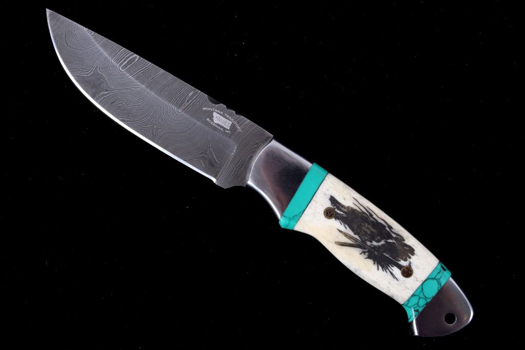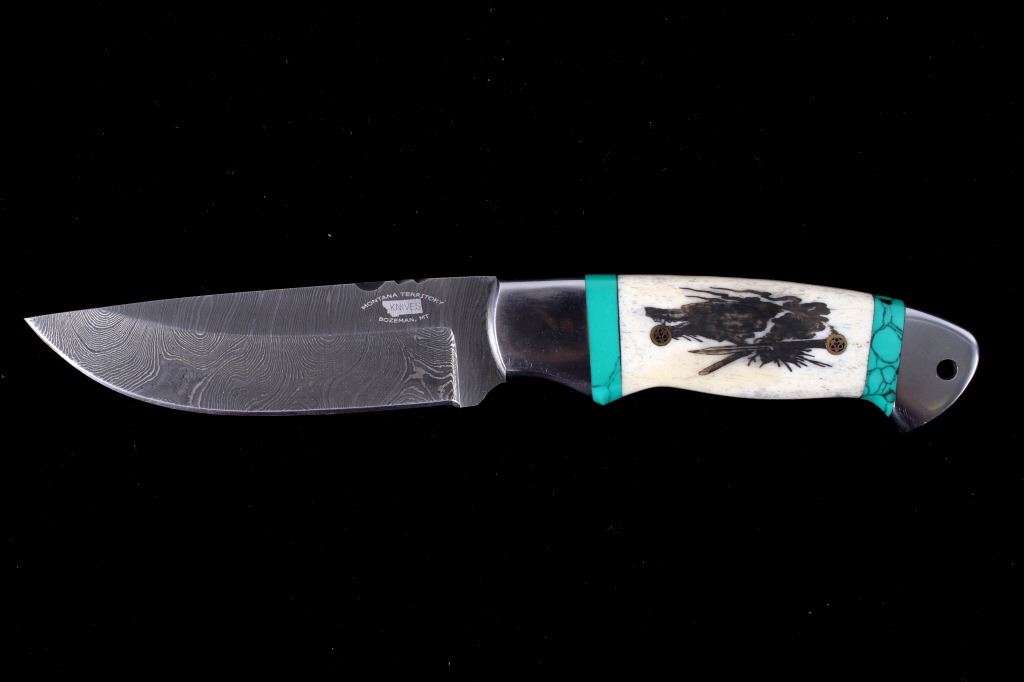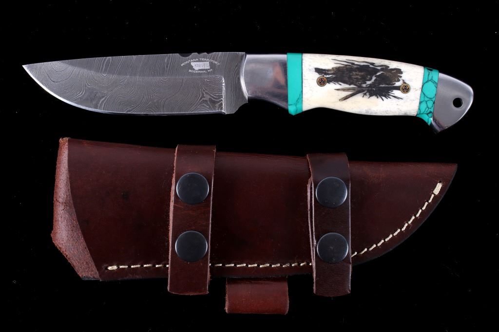 This is an original Montana Territory Knives of Bozeman, Montana knife with an excellent Montana Hunt scrimshaw artwork and beautiful turquoise inlay. The blade has been forged from 1095HC (High Carbon) steel and 15N20 Nickel Carbon which is then heated and folded into 396 layers creating the astounding “Damascus” steel. The knife shows a wonderful highly detailed mosaic ladder Damascus. The hollow grind full tang blade has been paired with a set of nice white wild animal (possibly Buffalo) bone grip scales which are secured to the piece using two mosaic pins of brass and copper. The knife also features a set of polished stainless-steel bolsters with a comfortable finger well. The tang and knife spine have been artfully hand vine filled. The grips have also artfully been scrimshaw etched with image of the a Montana hunt scene showing a wolf, cap and ball dueling pistol and fighting knife. The knife is in brand new condition and comes with a Certificate of Authenticity along with a Lifetime warranty. The blade is marked with the “MONTANA TERRITORY KNIVES BOZEMAN MONTANA” stamping which shows the outline of Montana. The knife has been paired with a Great American Bison Buffalo leather hand crafted sheath. The knife measures overall 8.75” in length with the blade being 4 3/8” long. The sheath and knife together measure 9.25” long.