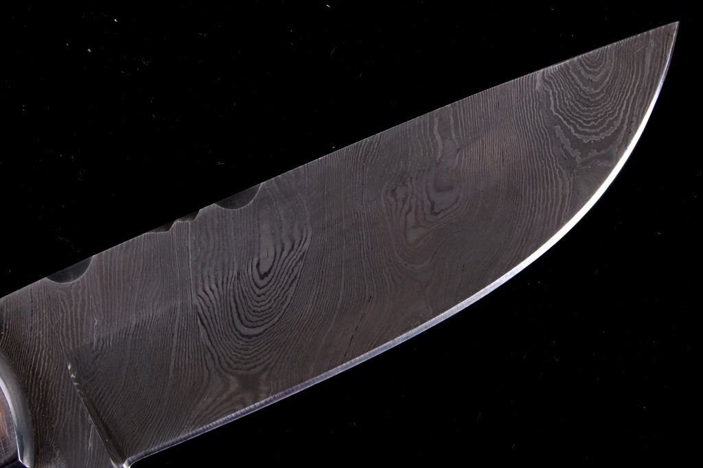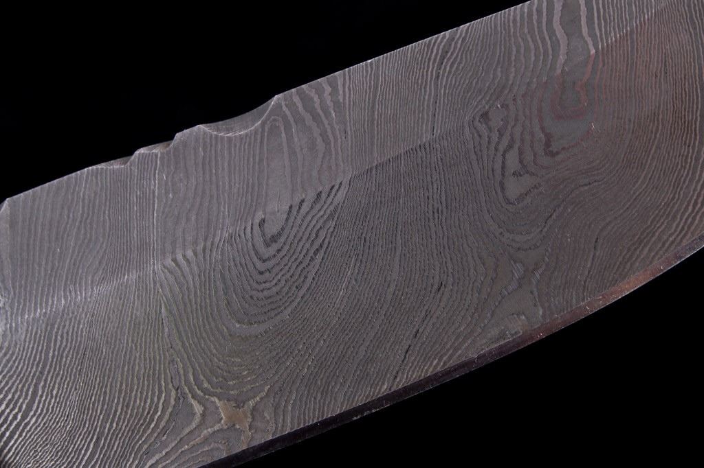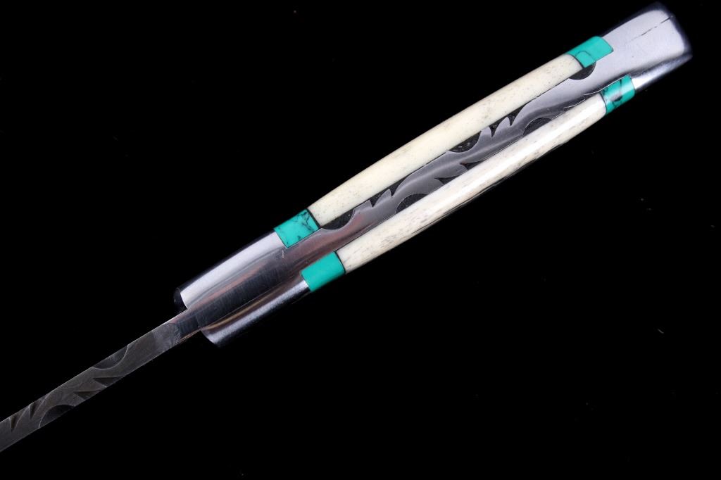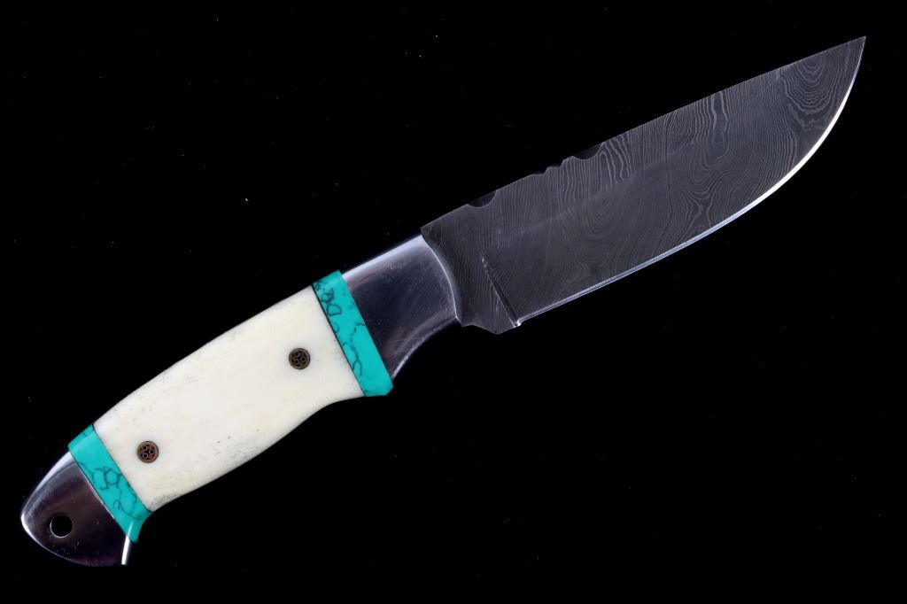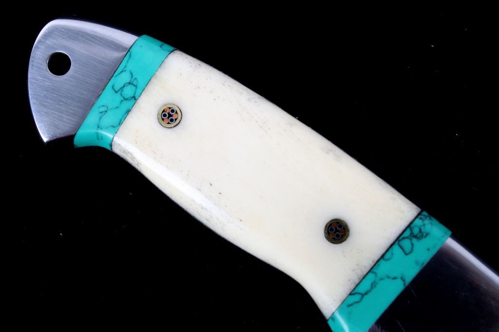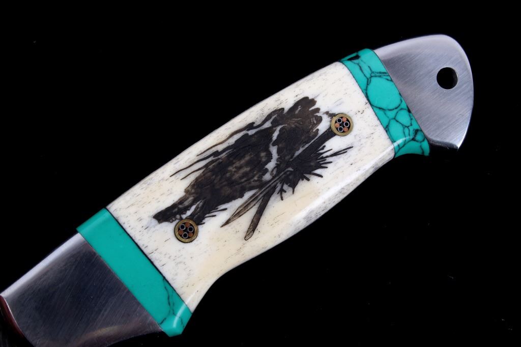 This is an original Montana Territory Knives of Bozeman, Montana knife with an excellent Montana Hunt scrimshaw artwork and beautiful turquoise inlay. The blade has been forged from 1095HC (High Carbon) steel and 15N20 Nickel Carbon which is then heated and folded into 396 layers creating the astounding “Damascus” steel. The knife shows a wonderful highly detailed mosaic ladder Damascus. The hollow grind full tang blade has been paired with a set of nice white wild animal (possibly Buffalo) bone grip scales which are secured to the piece using two mosaic pins of brass and copper. The knife also features a set of polished stainless-steel bolsters with a comfortable finger well. The tang and knife spine have been artfully hand vine filled. The grips have also artfully been scrimshaw etched with image of the a Montana hunt scene showing a wolf, cap and ball dueling pistol and fighting knife. The knife is in brand new condition and comes with a Certificate of Authenticity along with a Lifetime warranty. The blade is marked with the “MONTANA TERRITORY KNIVES BOZEMAN MONTANA” stamping which shows the outline of Montana. The knife has been paired with a Great American Bison Buffalo leather hand crafted sheath. The knife measures overall 8.75” in length with the blade being 4 3/8” long. The sheath and knife together measure 9.25” long.