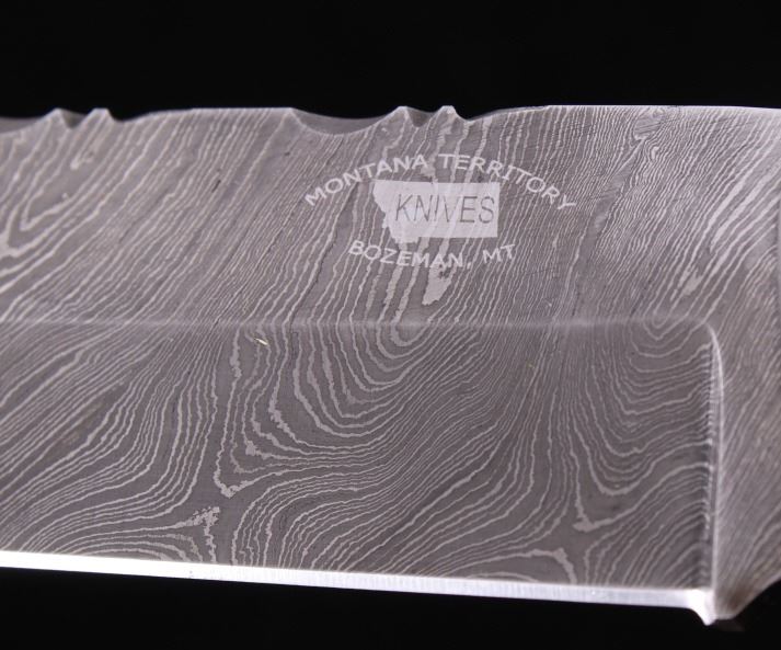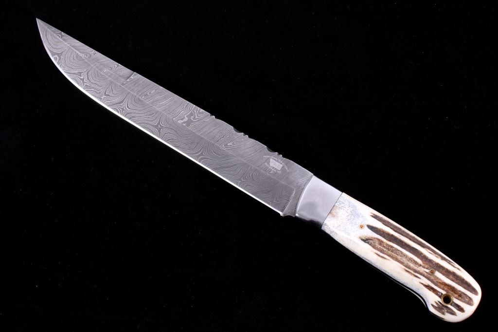 This is an original handmade high-quality ladder Damascus knife from the Montana Territory Knives of Bozeman, Montana. The knife blade has been forged from 396 layers of very high quality 1095HC (High Carbon) steel and 15N20 Nickel Carbon which is then heated and folded creating the astounding “Damascus” steel. The knife shows a beautiful custom ladder Damascus pattern. The hollow grind full tang blade is then paired with this exceptional premium Sambar Stag Antler grip scales. The handle shows a high polished stainless-steel bolster. The scales are held onto the full tang blade with two mosaic pins. At the end of the knife shows the lanyard loophole which is also brass. Sambar Stag antler from India is one of the finest grip materials and is in high demand with very limited supply due to the current ban, this set is all pre-ban. The back of the blade tang shows intricate hand done vine file engraving work which artfully accents the already beautiful handmade knife. The blade is in Montana Territory Knives large Rainbow Trout Fillet bowie knife pattern having a nice slender long blade with good strength. The knife has been paired with a Great American Bison Buffalo leather hand crafted sheath which has been partially hand tooled. The knife is in brand new condition. The blade is marked with the “MONTANA TERRITORY KNIVES BOZEMAN MONTANA” stamping which shows the outline of Montana. The knife measures overall 14” in length with the blade being 9” long.