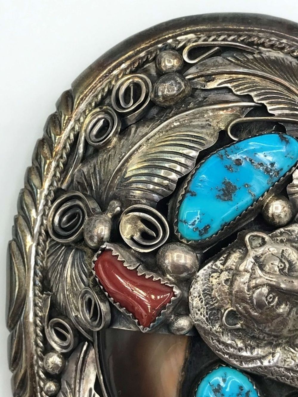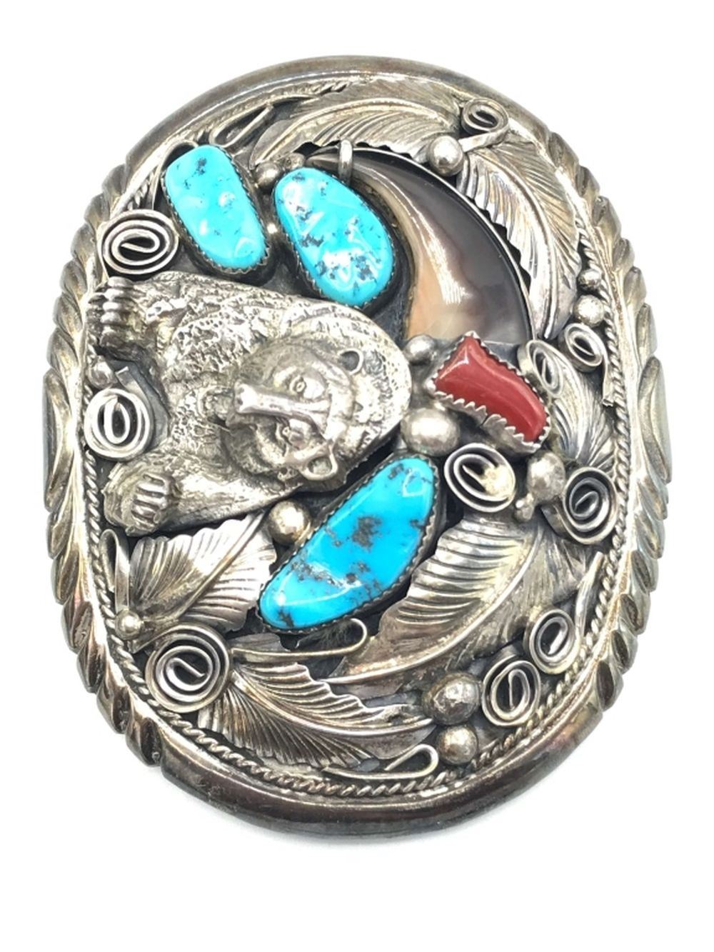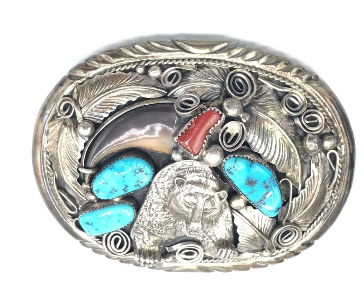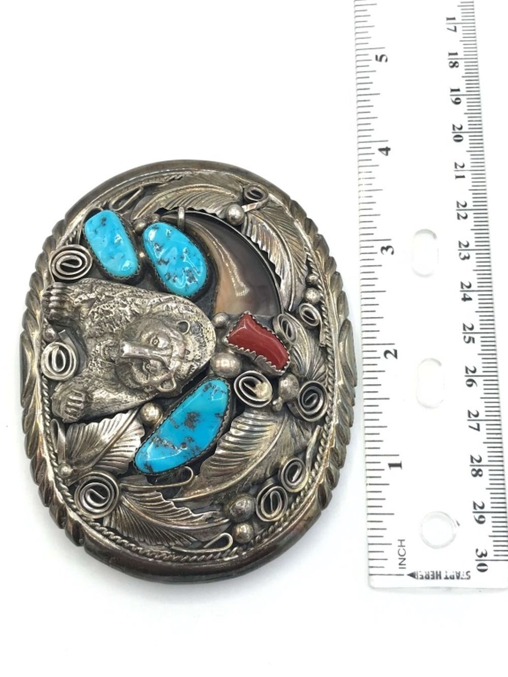 61 DWT TOTAL Navajo Native American Belt Buckle made from sterling silver, coral, and turquoise. It is stamped Sterling and M Thomas Jr