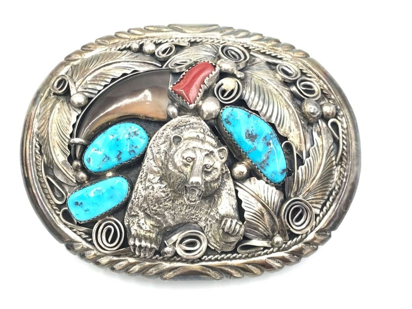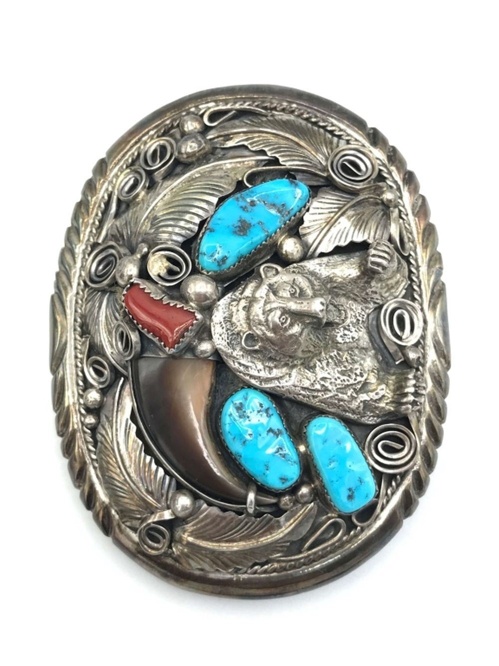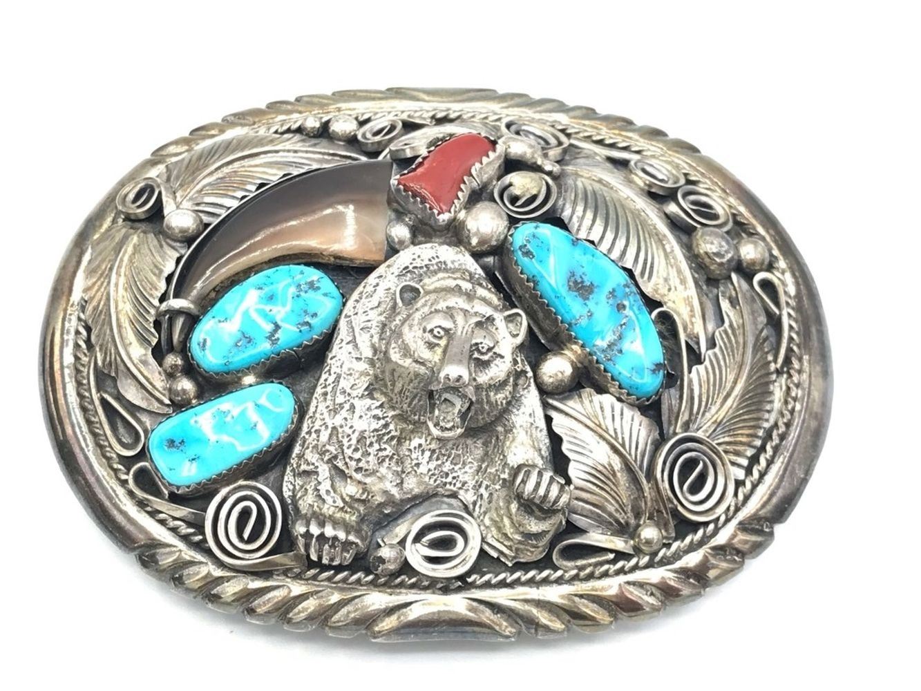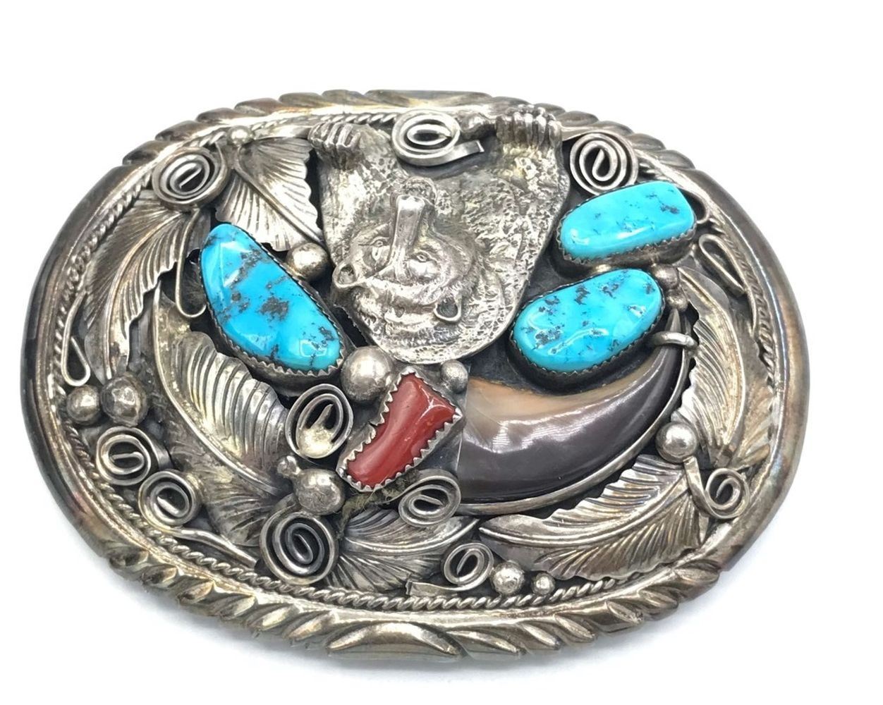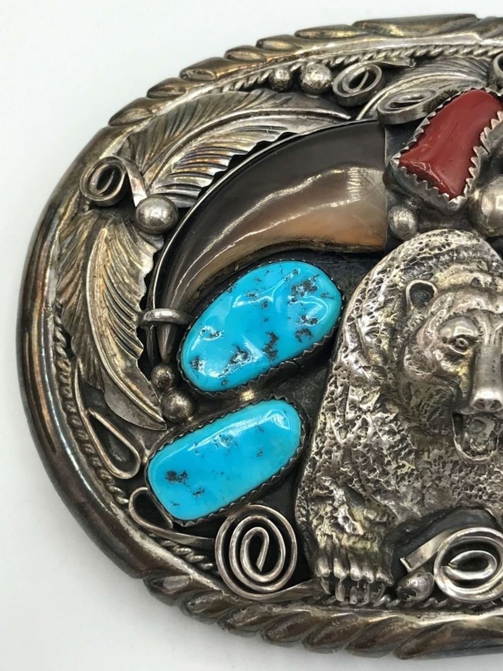 61 DWT TOTAL Navajo Native American Belt Buckle made from sterling silver, coral, and turquoise. It is stamped Sterling and M Thomas Jr