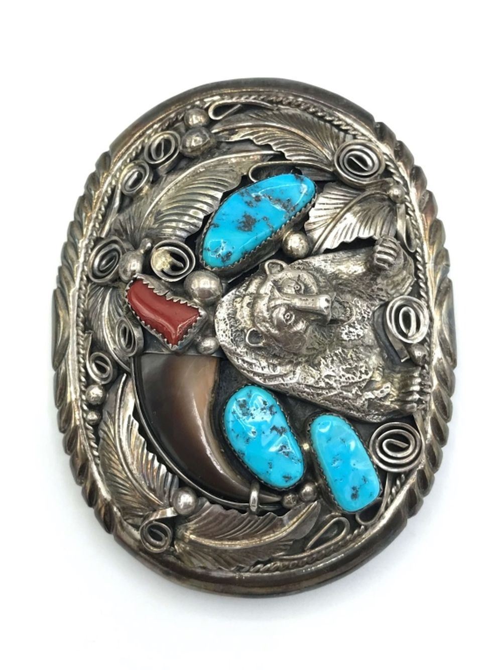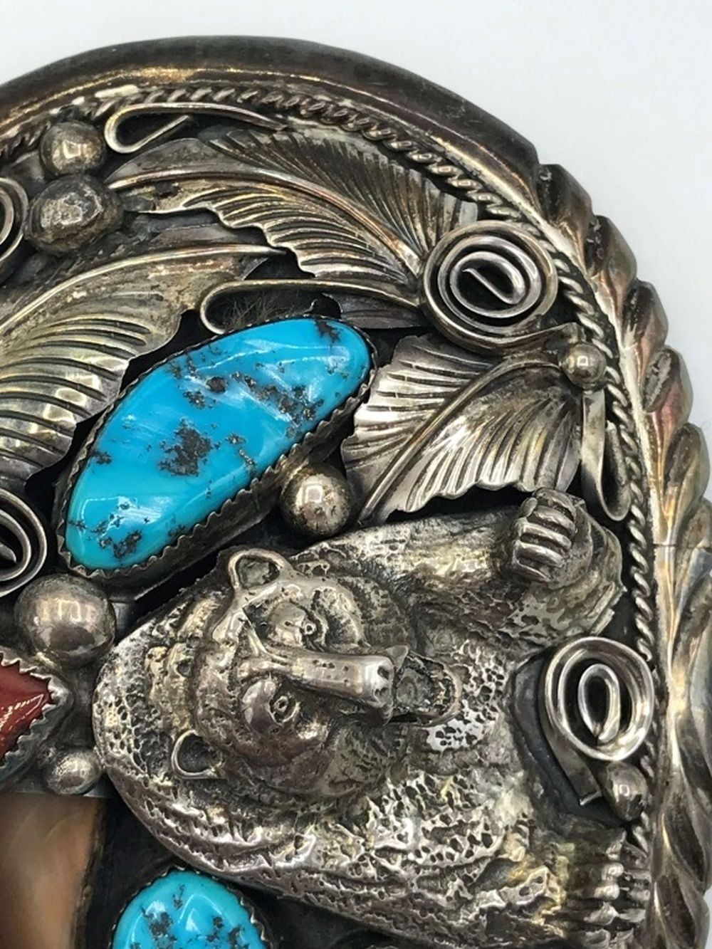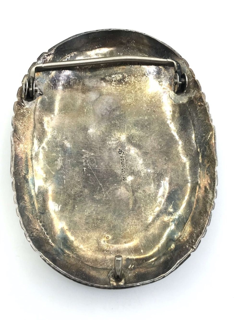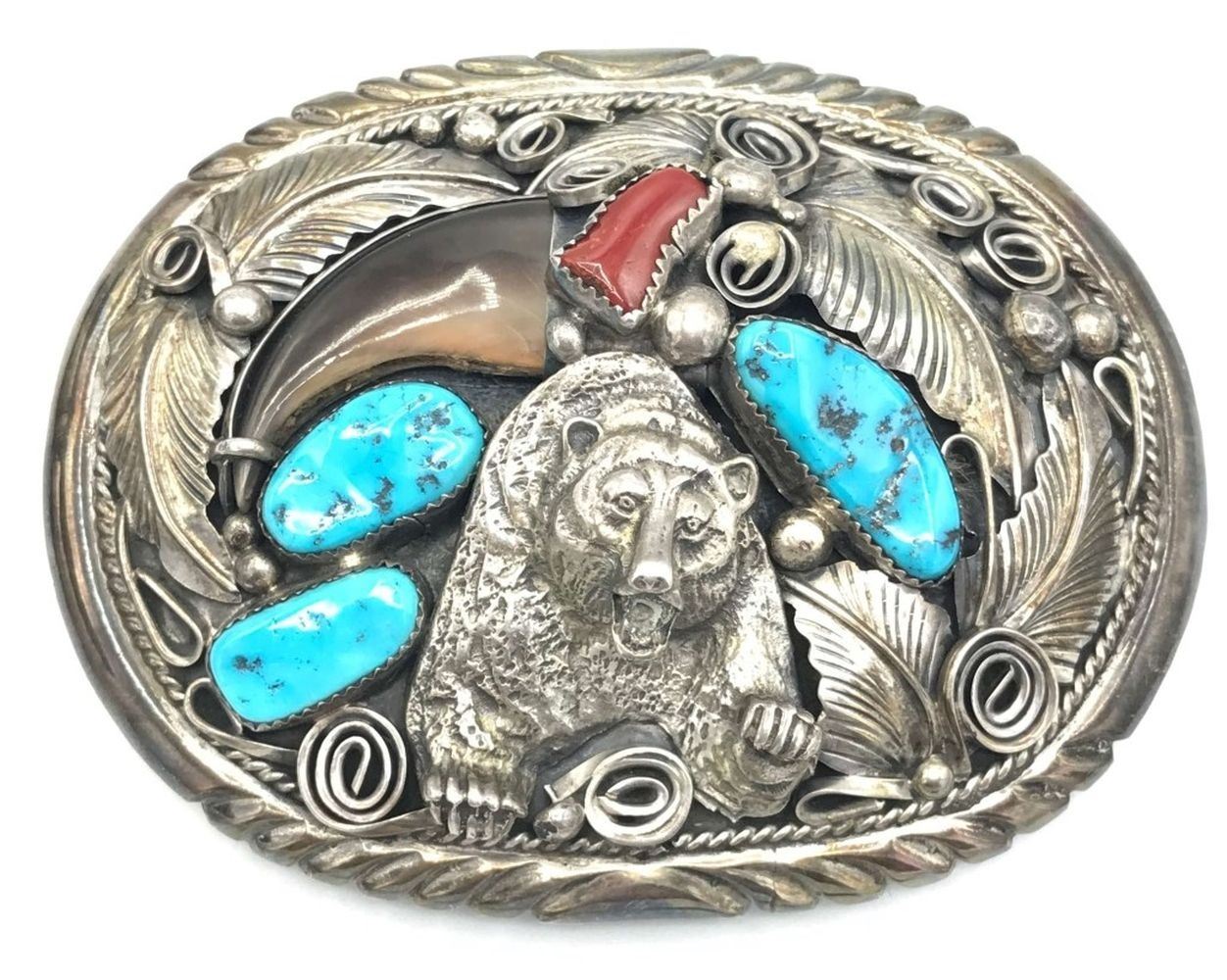 61 DWT TOTAL Navajo Native American Belt Buckle made from sterling silver, coral, and turquoise. It is stamped Sterling and M Thomas Jr