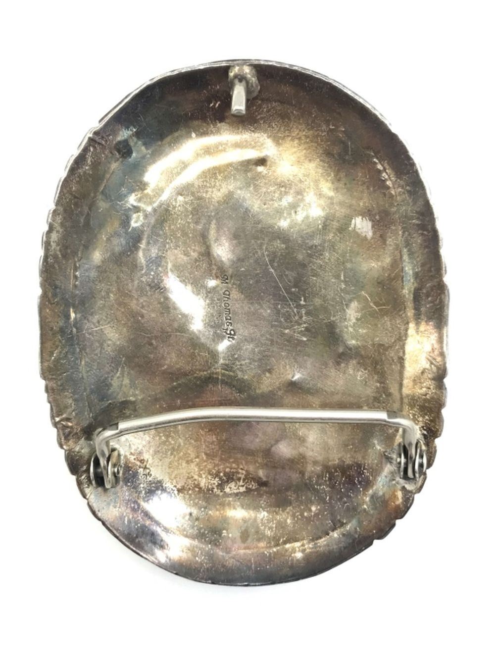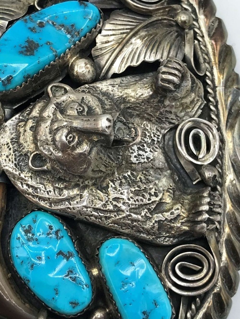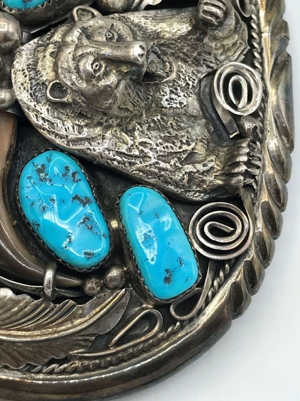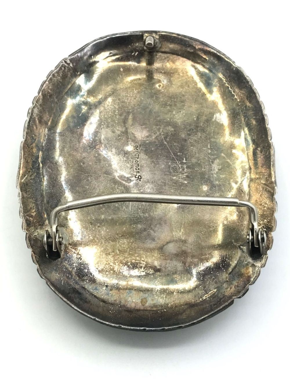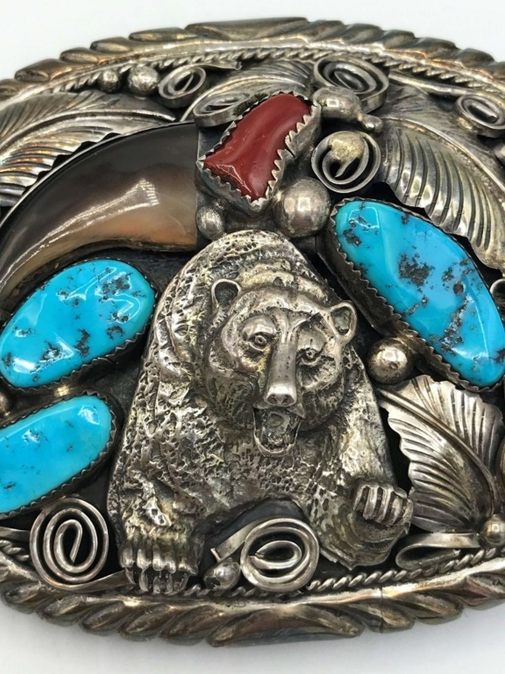 61 DWT TOTAL Navajo Native American Belt Buckle made from sterling silver, coral, and turquoise. It is stamped Sterling and M Thomas Jr