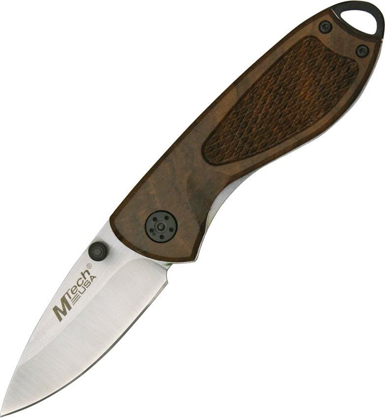 Linerlock - 4 1/8" closed. 440 stainless blade with dual thumb studs. Checkered brown wood handles. Oversized lanyard loop. Black finish stainless pocket clip.