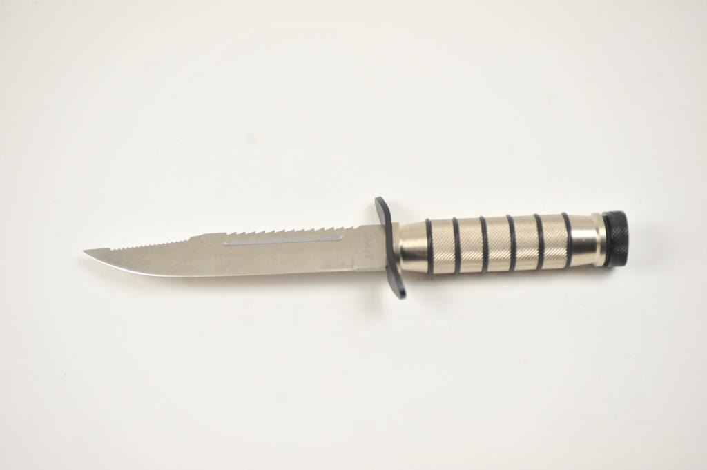 M Tech survival knife with ballistic nylon belt scabbard. The knife is as new with an overall length of 9 ¼” and a 5 ½” blade with sawback. The handguard is black painted steel with a checkered steel grip with rubber O-ring spacers and a knurled screw off pommel with compass in the lid. The blade is bright and marked 440 steel and China at the handguard. The ballistic nylon scabbard is in excellent condition. Est.: $25-$50.