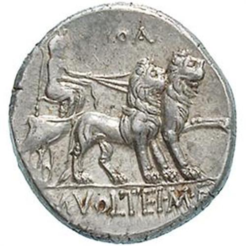 Repubblica Romana. M. Volteius M. f. Denarius, 78 a.C. D/ Busto laureato ed elmato di Attis a destra. Dietro, cerchio in prospettiva. R/ Cybele, su biga di leoni a destra, li guida al passo e con la destra ostenta una patera. In esergo: M VOLTEI M F. In alto, oA. Cr. 385/4. B. 4 Banti 4/31. gr. 4.02 R. AE. SPL. Molto raro di questa qualit. Fondi lucenti.