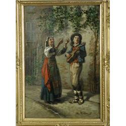M. WILLENICHCONTINENTAL COUPLE PLAYING MUSIC AND SINGING IN A STREEToil on canvas, signed bottom right, dated 1875. 12 1/2" x 8 3/8" (32 x 21cm) Est.800/1000