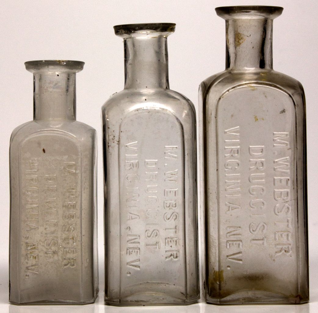 Three square examples: 4", 4.5", 4.5" tall. This is the only pattern of this fairly rare clear drug store that is only found in square bottles generally in the four ounce size. The bottles were made by Wiliam McCulley & Co. of Pittsburgh and marked with the typical CcC on the base. - Jacobitz Collection -59599