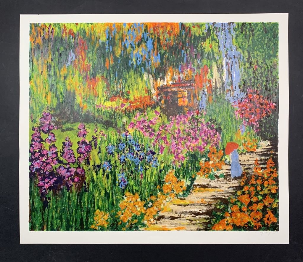 M. Wolfson's "After Monet" limited edition print, signed lower right and numbered 82/275 lower left. This piece is of a garden full of beautiful colourful flowers, done in a similar style to that of Claude Monet. This piece is in near excellent condition, with a miniscule incision at top.