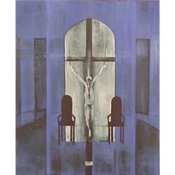 CRUCIFIX WITH TWO CHAIRS, acrylic painting on canvas, 48 1/2 x 39 1/2", signed lower right. $1000/1500