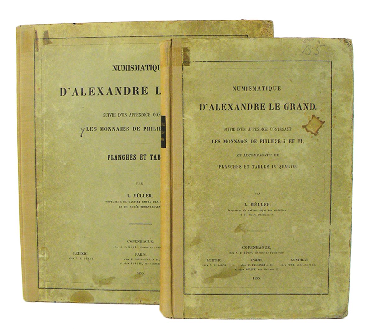 Müller, L. NUMISMATIQUE D'ALEXANDRE LE GRAND. SUIVIE D'UN APPENDICE CONTENANT LES MONNAIES DE PHILIPPE II ET III, ET ACCOMPAGNÉE DE PLANCHES ET TABLES IN QUARTO. Copenhagen, 1855. Two volumes. Text volume 8vo, plate volume square 4to, matching later tan cloth-backed boards; black spine labels, gilt; original printed wraps mounted. xiv, (2), 401, (1); (2), xxx-xl, (1) pages; 29 engraved plates. Inscribed by the author in the text volume. Covers a bit worn; plate volume with joints weak, but holding. Very good. Text volume inscribed by the author to Prof. C.J. Tornberg. Carl Ludvig Müller's life (1809-91) spans the nineteenth century. The foremost Danish numismatist of his time, Müller catalogued, for the first time, many of the ancient coins in the Royal Coin Cabinet at Copenhagen. He wrote four major works on ancient Greek coins, all of which are still consulted, and the monumental work at hand won for him the numismatic prize of the French Academy. Though the plates have been reprinted various times, the original work, with the extensive text volume in French, rarely comes to market. Clain-Stefanelli 2341*.