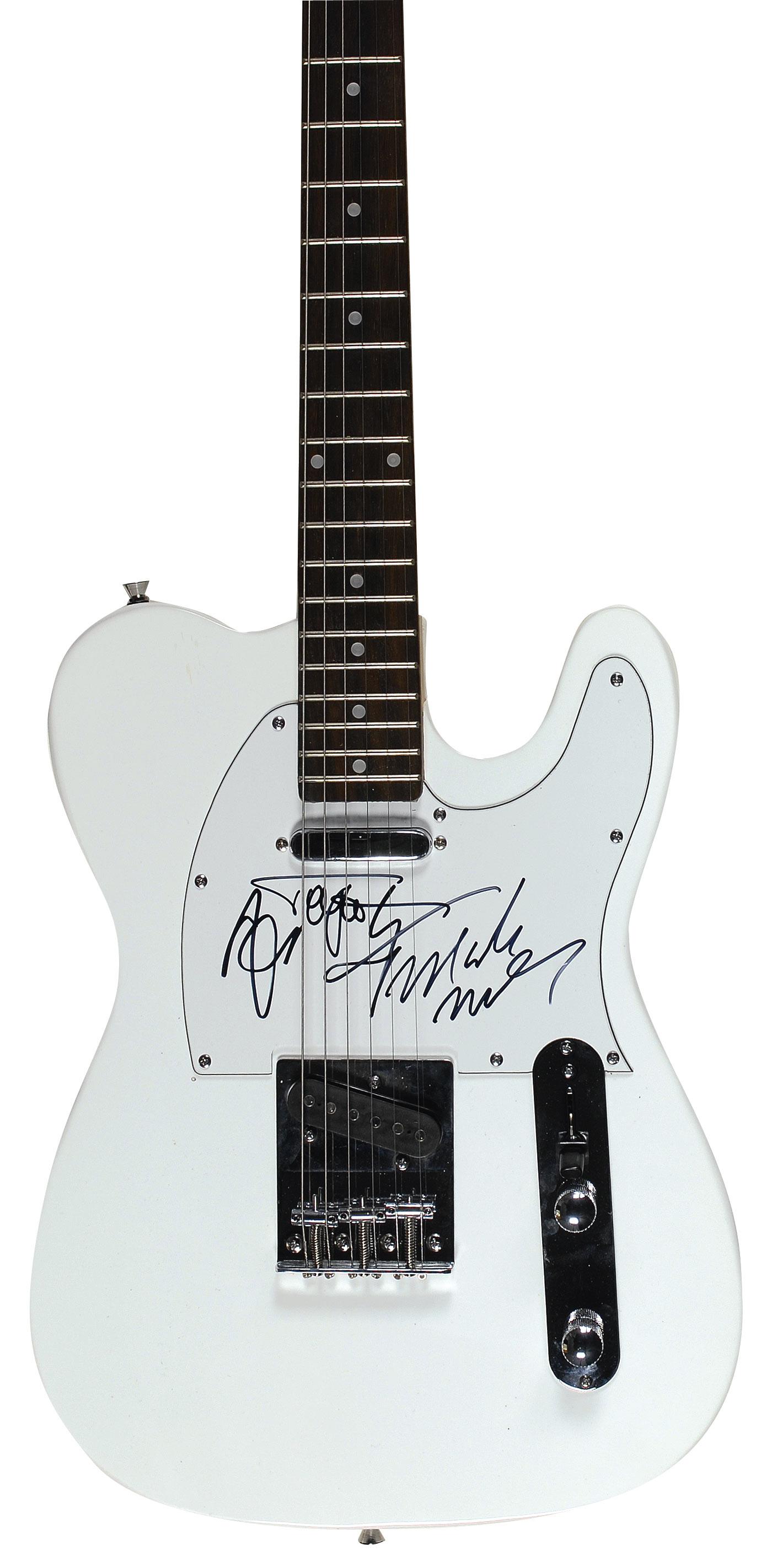 White-bodied Stedman Pro ‘telecaster-style’ electric guitar, signed in black felt tip on the white pickguard by Vince Neil, Tommy Lee, Mick Mars, and Nikki Sixx. In fine condition. Oversized. Pre-certified PSA/DNA and RRAuction COA.