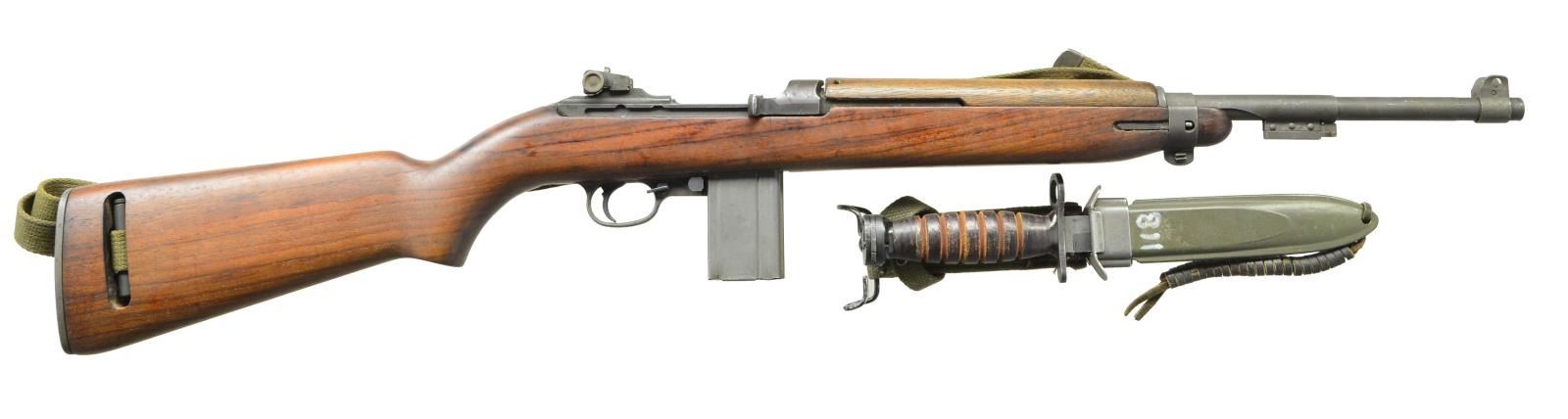 SCABBARD. Cal. 30 Carbine. S# 2665852. The 18" bbl. is marked “UNDERWOOD” and dated “1-43”. Standard front sight is stamped “EU”. Parkerized action with model and caliber on receiver ring has blued bolt. Rear is fitted with windage and elevation adj. rear sight and is marked “UNDERWOOD” and with serial number and “B”. Standard pistolgrip stock has very light large ordnance cross cannon mark on right side of butt. A circled “P” is also very lightly stamped on bottom of grip. Carbine is fitted with web sling. MAGS: 1 detachable Parkerized 15 rd. CONDITION: good. Metal parts with most of what appears to be their original Parkerized finish with some browning and freckling on operating handle. Wood lightly refinished over a some minor dents and bumps. Stock appears to have been sourced from a carbine that had a scope mount and there is a 3 1/2" area at left side of action cut away. Shiny bore. Mechanically good. Carbine is equipped with mark 4 bayonet with leather handle in M8A1 scabbard with rack number “118” painted on. Bayonet is fine with marks on Parkerized blade, leather relatively bright, scabbard is good. (22-4120/MGM). CURIO. $1,000-1,500.