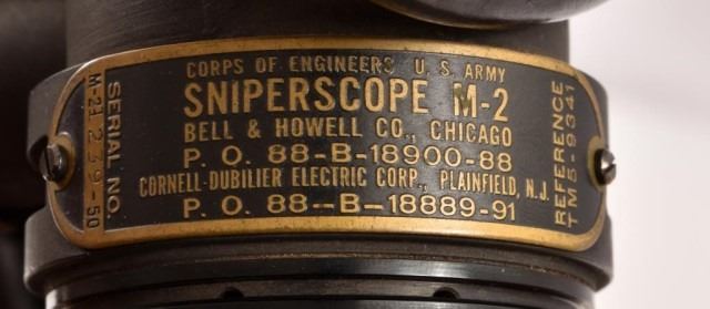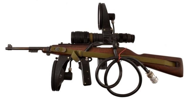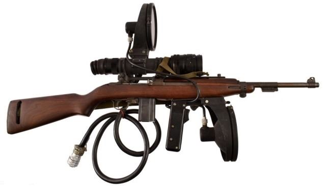 * IBM M1 carbine .30 cal fitted with Bell & Howell U.S. Army Corps of Engineers M2 Sniperscope with dual lamps. Developed in late 1944, the M2 Sniperscope saw limited use in the Pacific theater during WWII