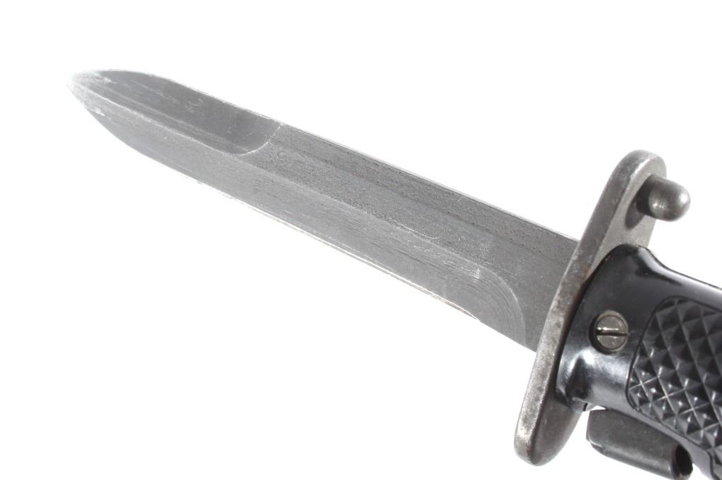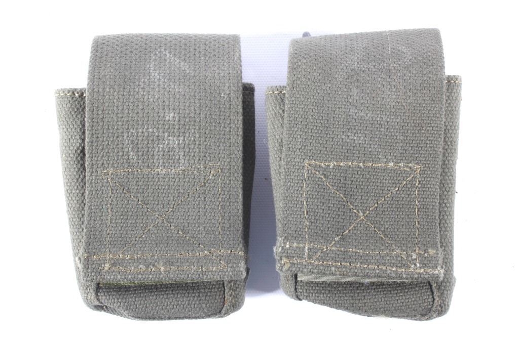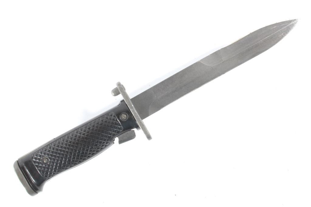 Offered for sale is a Korean War M1 Garand M5-1 J&D Tool Co. and M8 BM CO. Scabbard with Canvas Velcro Ammo Pouches. The bayonet features a 6 3/4" blade. The M5 was introduced in 1953 to replace the M1 and M1905E1 bayonets used with the M1 rifle. The M5 mated the blade of the M4 bayonet with a hilt incorporating a novel attachment system. In place of a muzzle ring, the crosspiece had a steel stud that inserted into the M1 rifle's gas cylinder lock screw. The pieces are in good condition, with some slight wear from handling. The button on the scabbard appears to be bent and does not button.