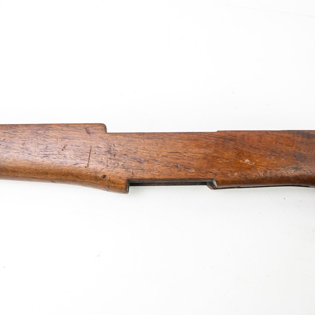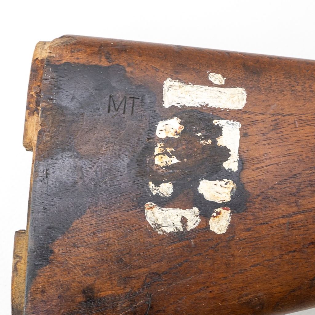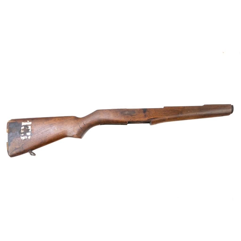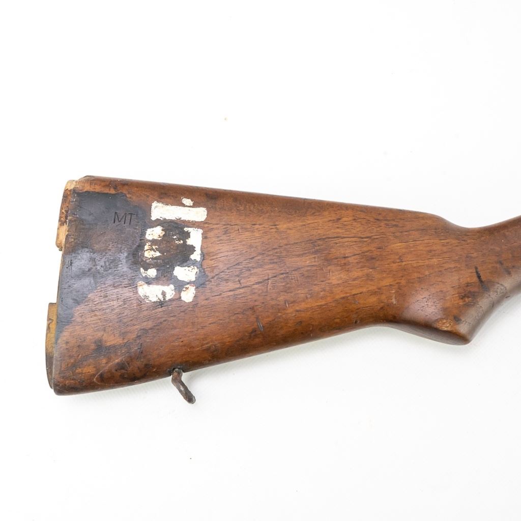 M1 Garand Wood Stock in very good condition with wear and some stains. It has a "MT" cartouche on the right side designating an Italian acquisition and a shortening of a 1/2" for a 308 re-calibering. It also has a painted rack # "155" on the right side.