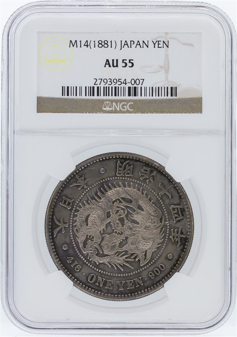 One M14 (1881) NGC AU55 Japan Yen Coin. NGC Certified.