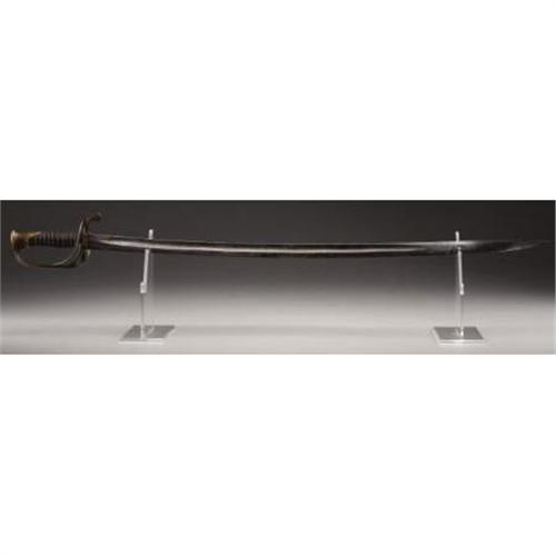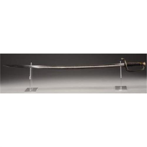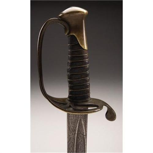 <B>RARE ETCHED BLADE BOYLE & GAMBLE CONFEDERATE FOOT OFFICER’S SWORD WITH DISTINCTIVE V GUARD</B></I>. FIG 2-g in Albaucgh’s ‘Photo Supplement’. Boyle and Gamble operated a manufactory on South 6th Street in Richmond and were prolific producers of all types of edged weapons for both private purchase and military outfitters such as Mitchell & Tyler. This pattern sword with the stylized V pierced in the guard was produced only by Boyle & Gamble and is quite rare. Brass hilt with flat guard, notched knuckle bow and distinctive Boyle & Gamble pommel cap. Leather covered grip with single strand brass wire wrap. 31” blade with unstopped fuller and characteristic flaw 1 ¾” from the hilt. The blade is etched for 2/3 of its length with vine, floral and scroll motifs and a cross hatched panel at the base of the obverse, unquestionably the work of Boyle & Gamble. There is no scabbard. An exceptional untouched example of this rare sword produced by the Confederacy’s most prolific manufacturer.<BR><BR><B>CONDITION:</B></I> Absolutely superb ‘attic’, as found condition with dark brown, almost black, patina on all brass and smooth dark patina on the blade. The blade retains about 80% of the distinctive etch. Leather grip excellent with just some minor scuffs, wire wrap perfect.<BR><BR><b>Shipping:</b> Requires 3rd Party Shipping (<a target="_blank" href="http://www.heritageauctions.com/common/shipping.php">view shipping information</a>)