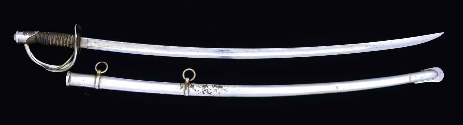 Overall length: 42 1/2". Blade length: 35". Plain single fullered blade marked at the ricasso, “MANSFIELD & LAMB FORESTDALE R.I.” on 1 side & “U.S. C.E.W 1864” on the other. Plated brass hilt originally w/ a wire wrapped leather grip. Iron scabbard. CONDITION: blade has been heavily cleaned. Hilt has been nickel plated & is somewhat misshaped. All leather & wire is missing exposing the wooden core. Scabbard has also been nickel plated & plating is wearing away in spots. (02-14167/BF). $150-250.