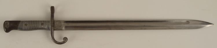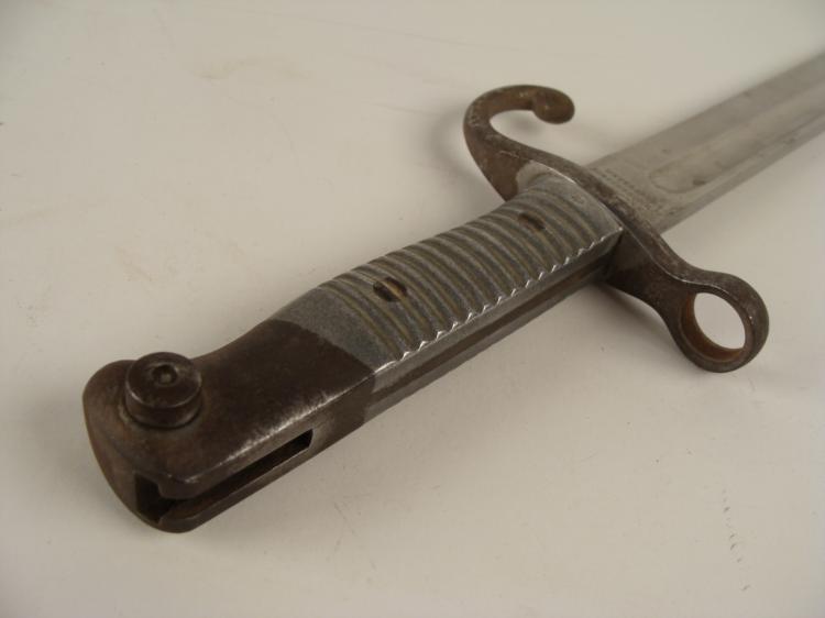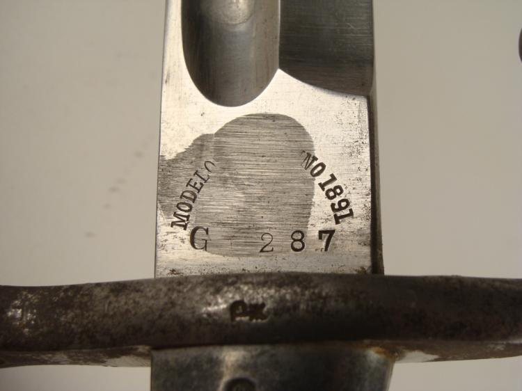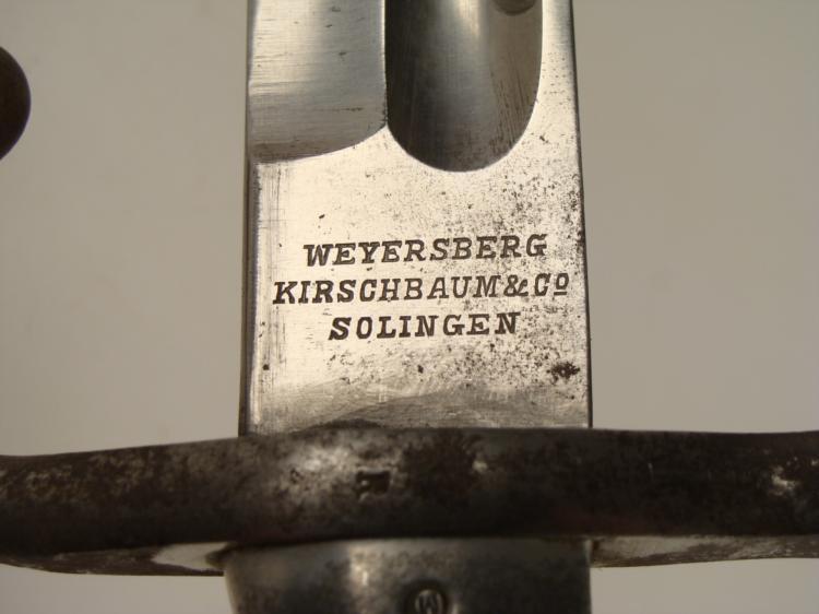 M1871 GERMAN MADE BY WKC BAYONET FOR ARGENTINA MILITARY * GREAT LOOKING CLEAN M1891 BAYONET--20" IN LENGTH--BEAUTIFUL CLEAN & UNSHARPENED BLADE WITH SINGLE FULLER--RICASSO IS STAMPED "WEYERSBERG KIRSCHBAUM & CO.-SOLINGEN" REVERSE IS PARTIALLY GROUND BUT READS MODELO ARGENTINO 1891--PROOF MARKS ON THE POMMEL & CROSSGUARD. NICE BAYONET--130 YEARS OLD.