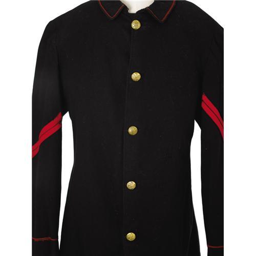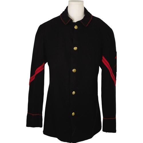 <B>M1874 Artillery Pioneer Corporal's Fatigue Blouse,</B></I> dark blue wool, five eagle buttons on front with two cuff buttons on each sleeve, red piping and insignia, left chevron enclosing schematic crossed axes. A wonderful Indian Wars jacket in exceptionally nice condition.<BR><BR><b>Shipping:</b> Clothing & Costumes (<a target="_blank" href="http://www.heritageauctions.com/common/shipping.php">view shipping information</a>)