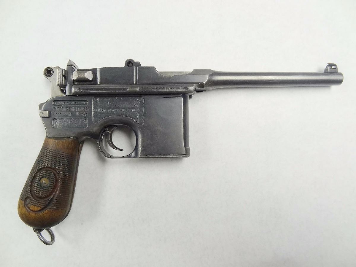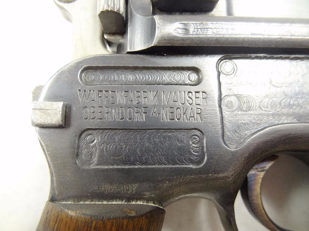 STOCK D-8, M1916 PRUSSIAN “RED 9” MAUSER C96 9MM, WWI PRODUCTION, CONFIRMED AUTHENTIC “RED NINE”. BOTH PISTOL AND STOCK IN VERY GOOD CONDITION. ALL NUMBERS MATCH, INCLUDING STOCK.AS PICTURED, NO VOLLEY SIGHTS. 5.5” BARREL. S/N:20XXX