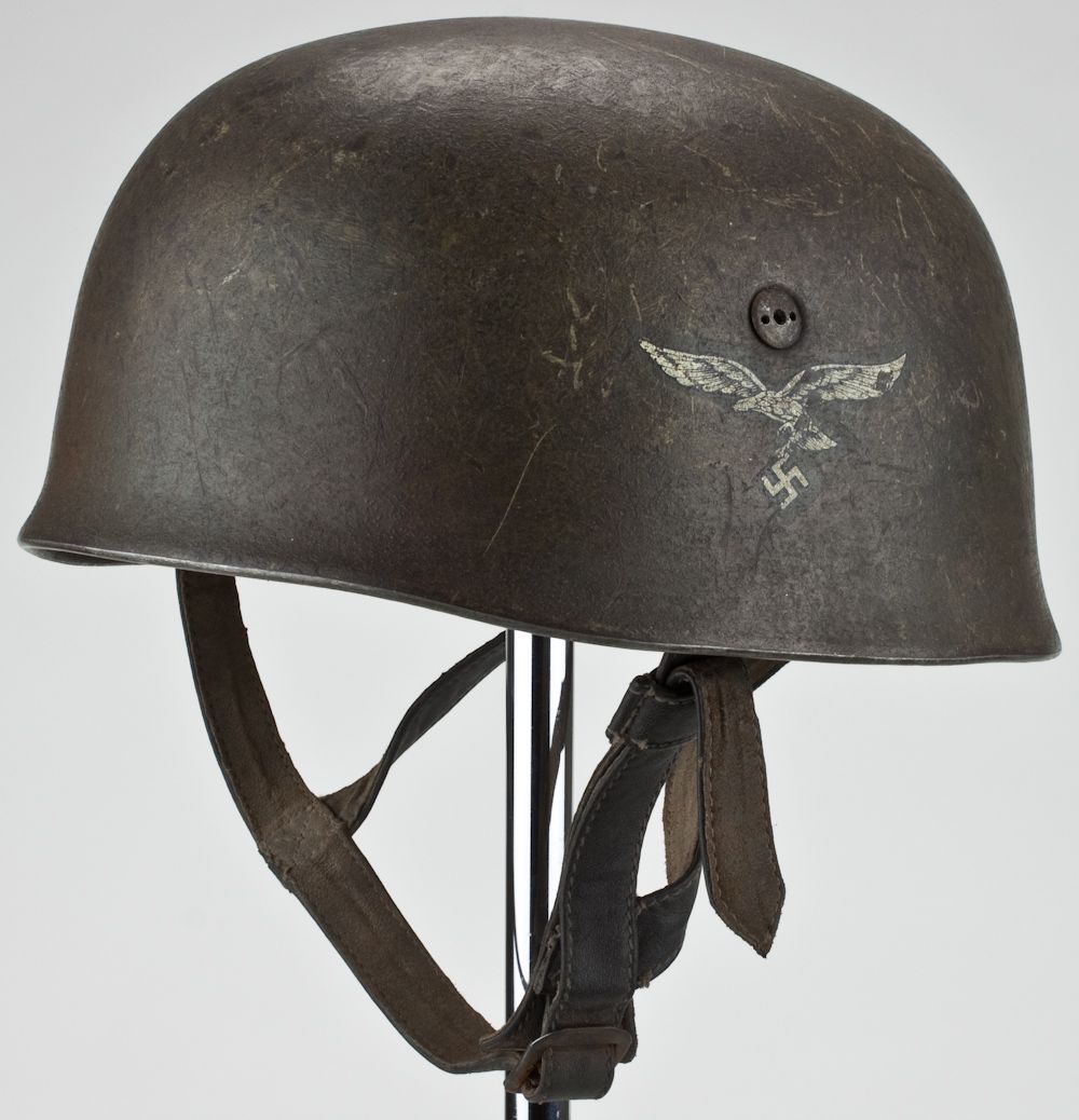 M38 German Fallschirmjaeger (paratrooper) helmet, single decal (left) 90% intact, in light camo colors of green, brown and tan. The liner is secured with four spanner bolts, all secure and apparently untouched. The liner is likewise in excellent condition, tight fitting and completely original to the helmet. The seven black foam pads amd foam top liner still retain flexibility, and the brown leather liner is supple and untorn, with tight stitching. Liner is ink-stamped with size 57, also manufacturing details: "Baumuster: Heisler, Berlin C2 Hersteller: F. W. Muller jr.". Y-shaped chinstrap present, in good condition, also with stitching complete. A fine example of one of the rarest German helmets.