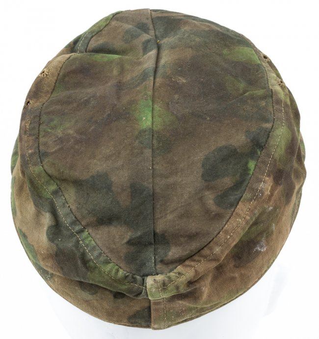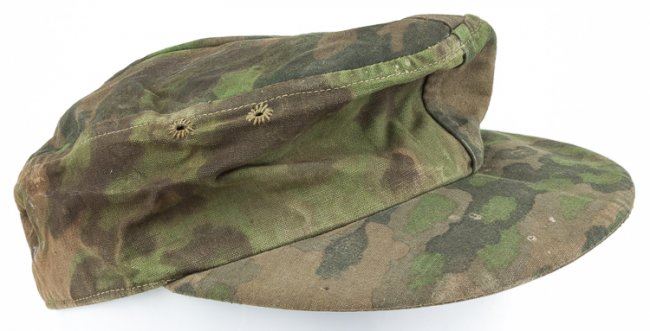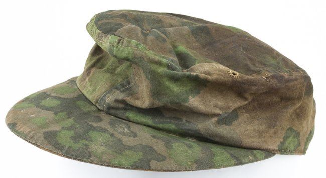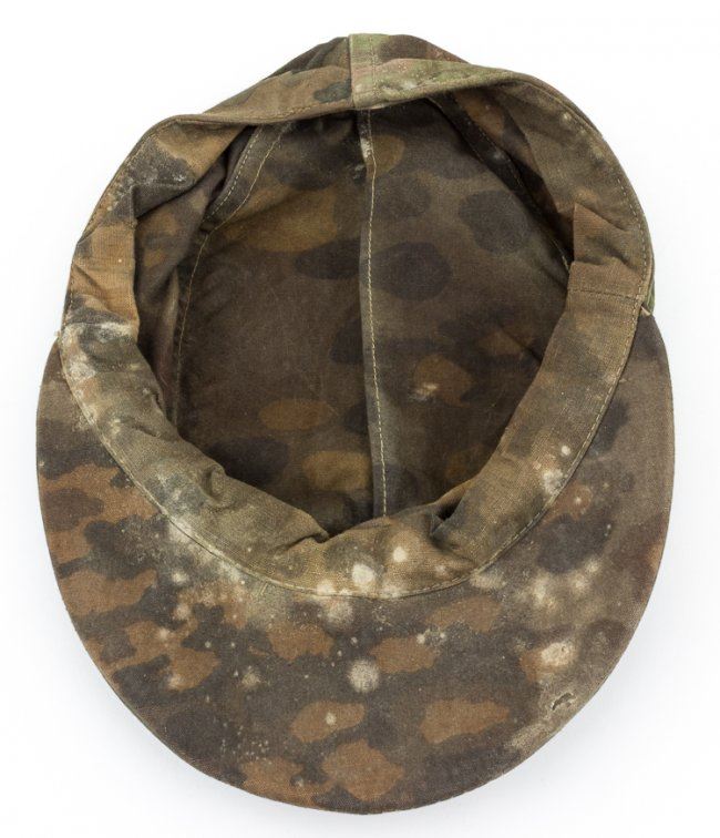 M1943 SS camouflage field cap, blurred edge pattern with thread-reinforced vent openings, two-part top construction. Well-worn with signs of old white mold within, visor cracked. A good original piece.