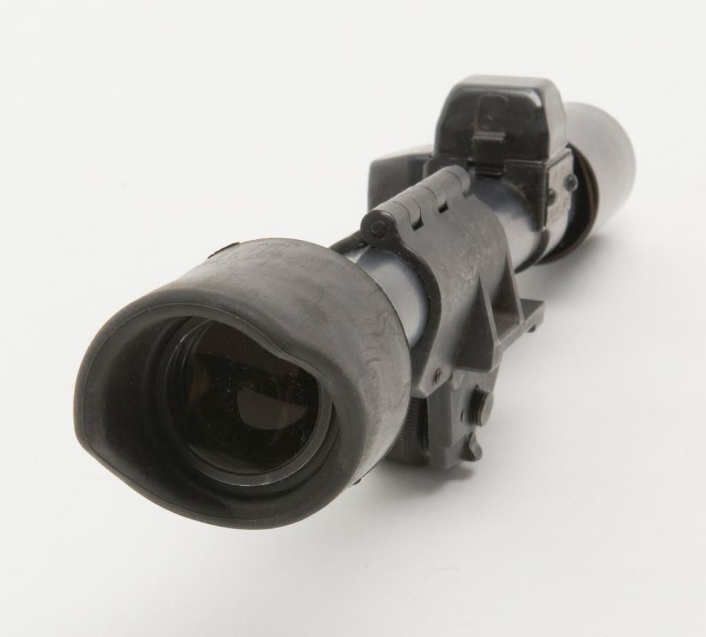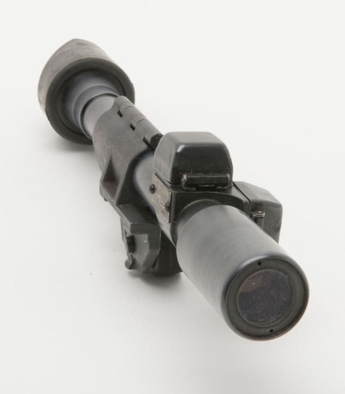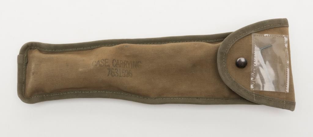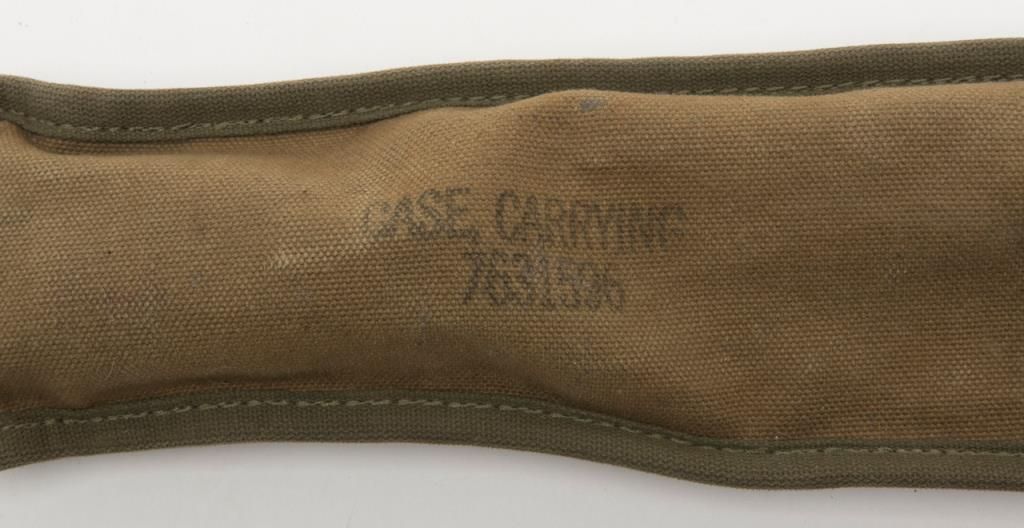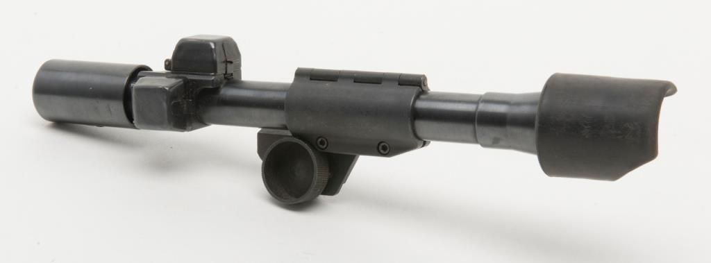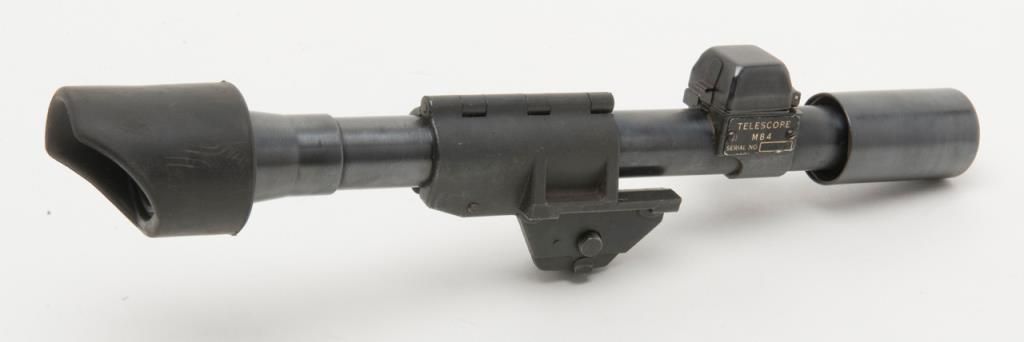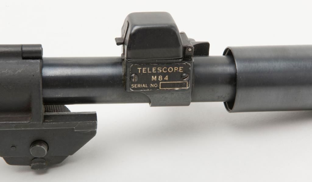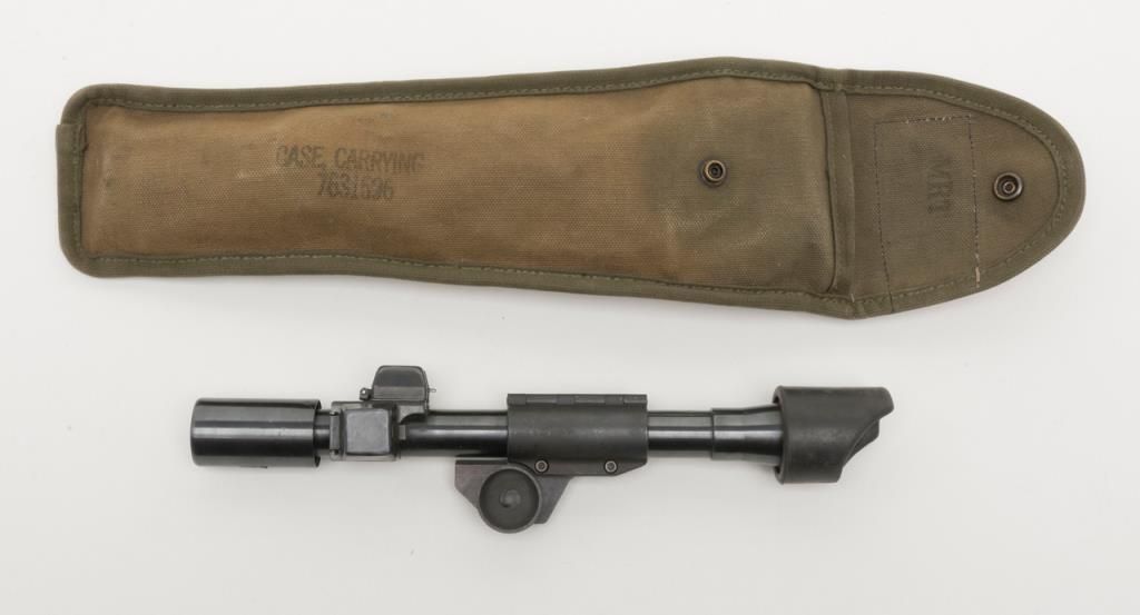 M84 telescope for an M1D Garand semi-auto rifle, serial #4872 in overall fine condition with mount, rubber eye piece and crisp optics; accompanied by a green woven military carry soft case. Est.: $350-$700.
