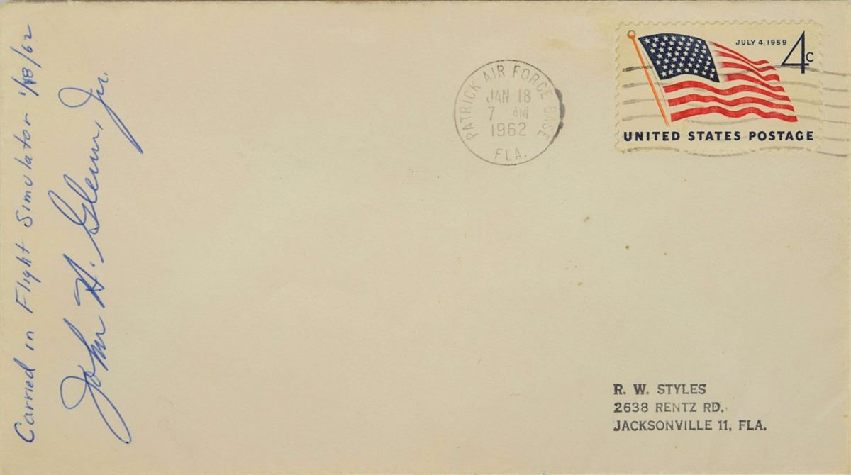Unusual cover carried in the spacecraft simulator during training for Mercury-Atlas 6, signed along the left edge, "Carried in Flight Simulator 1/18/62, John H. Glenn, Jr." Postmarked at Patrick Air Force Base on January 18, 1962. In fine condition. Accompanied by two cardstock photos of Glenn during training. This simulator-carried cover is as close to a flown cover from Mercury-Atlas 6 as exists—no covers were actually flown on the mission, which took place just over a month later on February 20th. Additionally, this is the only known such example of a 'simulator flown' cover from Glenn's historic mission. From the collection of aerospace memorabilia specialist Ken Havekotte. Pre-certified Zarelli Space Authentication.