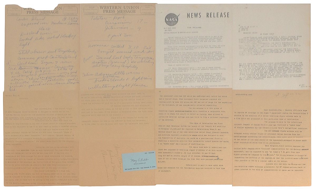 Collection of space journalist Mary E. Bubb’s materials related to the MA-8 launch of Wally Schirra aboard the Sigma 7 on October 3, 1962, including: two pages of her handwritten notes in ballpoint on Western Union ‘press message’ paper, in part: “Canton Island, as passed over Muchea…flare…looked like solid block of light. Still observe sent temp closely…Can’t hear Sigma 7 now…8:42 Calif. felt fine—on top of suit temp cont. problem—very good shape—‘chimp configuration’…particles—John’s ‘friends’…Schirra advises little warm…broken clouds…will attempt light flares”; a NASA press release; recovery ship wire-teletype transmission page; and several pages of typed reports. In overall very good to fine condition. Accompanied by one of Bubb’s business cards from the 1990s and a biographical sheet. From the collection of aerospace memorabilia specialist Ken Havekotte.