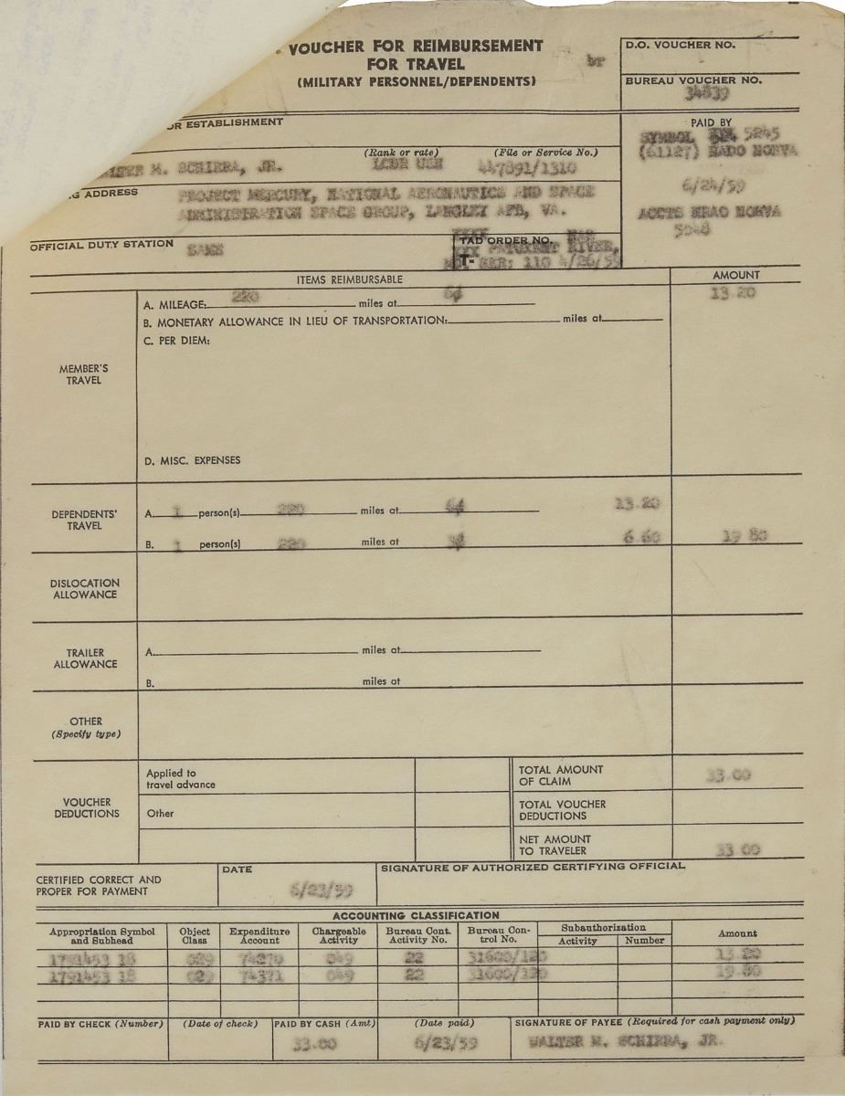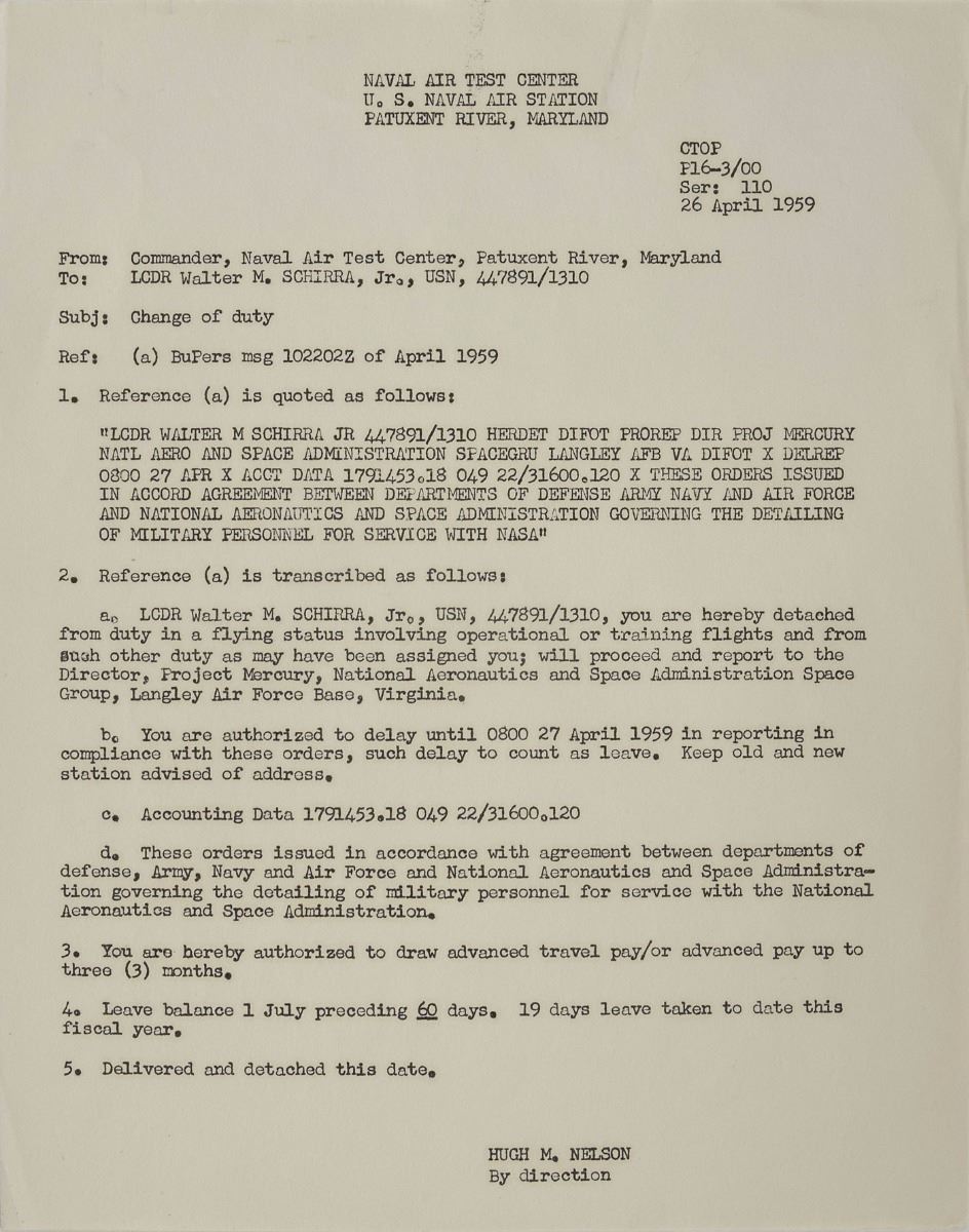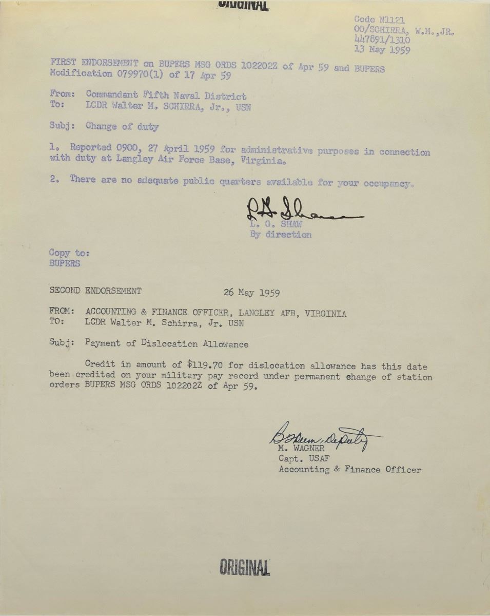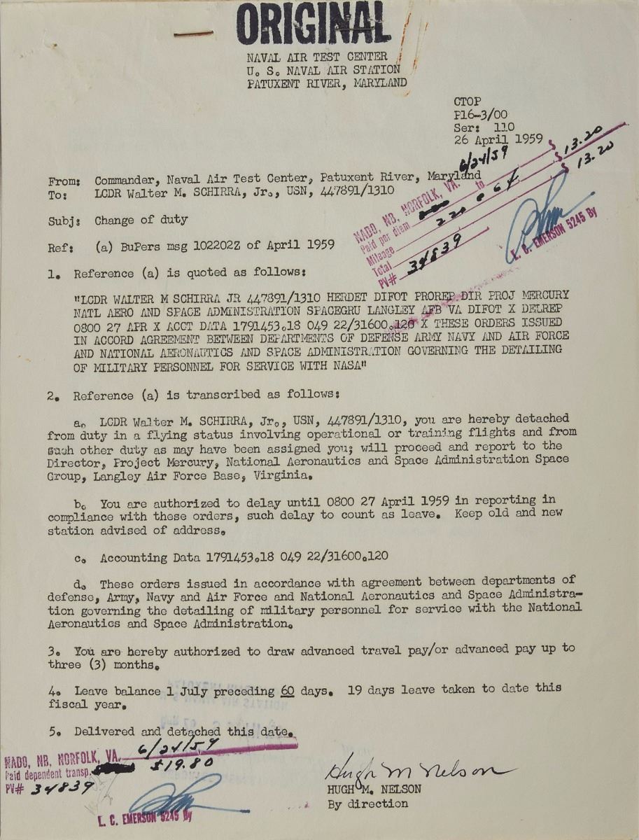Remarkable DS, one page, 8 x 10.5, April 26, 1959. Original orders from the Naval Air Test Center to Walter M. Schirra, Jr., for "Change of duty…issued in accord agreement between departments of defense Army Navy and Air Force and National Aeronautics and Space Administration governing the detailing of military personnel for service with NASA." The reference, in part: " You are hereby detached from duty in a flying status involving operational or training flights and from such other duty as may have been assigned you; will proceed and report to the Director, Project Mercury, National Aeronautics and Space Administration Space Group, Langley Air Force Base, Virginia." Signed by Commander Hugh M. Nelson, with two payment stamps signed by L. C. Emerson. Attached to the document is the original transcript for first and second endorsement, and a travel reimbursement voucher for Schirra, totaling to a sum of $33, dated June 23, 1969. Includes a copy of original orders. In fine condition, with staple holes and paperclip impression to top edge of first page. Prior to becoming one of America's original astronauts, Schirra honed his flying skills as a naval aviator and then as a veteran of 90 combat missions during the Korean War. Following training at the Naval Ordnance Training Station and the Naval Air Safety Officer School, Schirra completed test pilot's training at Maryland's Naval Air Test Center in 1959. In April of that year NASA announced that it had selected Schirra as one of the seven men for Project Mercury, joining fellow astronauts Alan Shepard, Gus Grissom, John Glenn, Scott Carpenter, Gordon Cooper, and Deke Slayton.