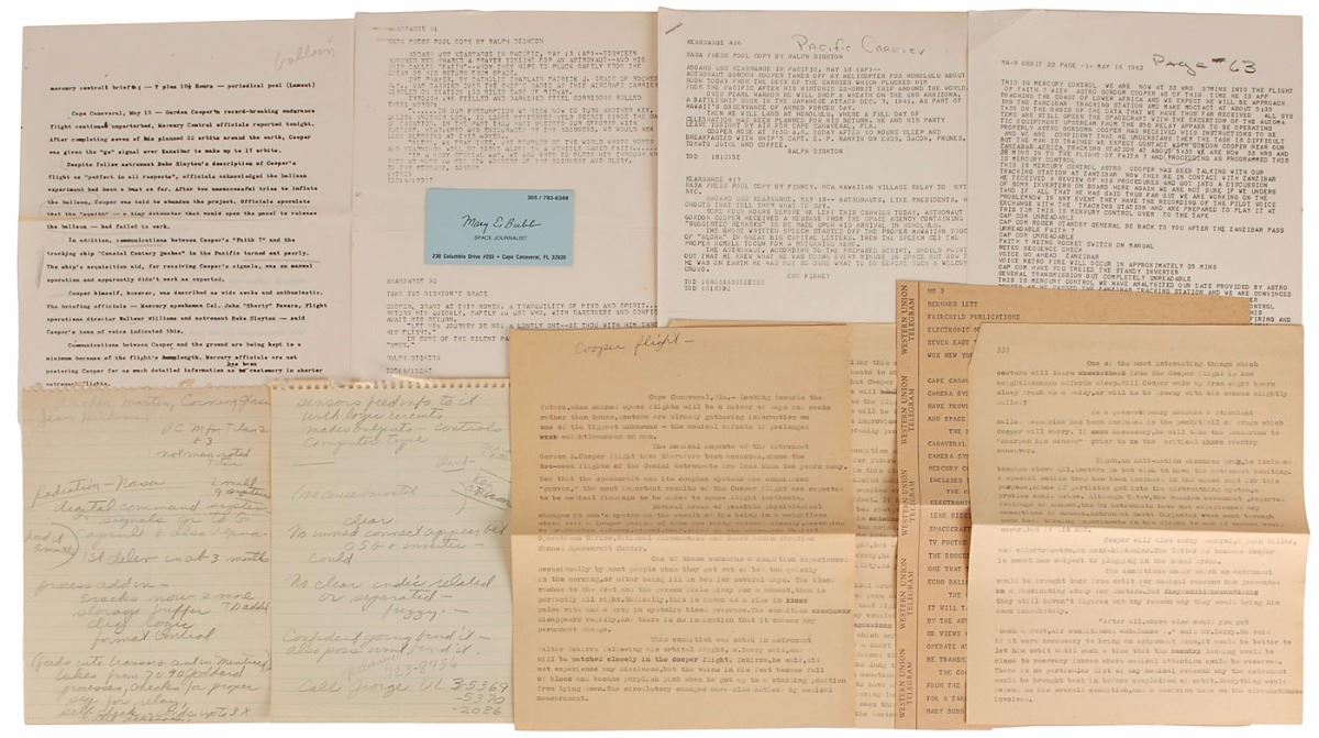 Collection of space journalist Mary E. Bubb’s materials related to the MA-9 launch of Gordon Cooper aboard the Faith 7 on May 15, 1963, including: two pages of her handwritten notes in pencil, in part: “Sensors feed into it with logic circuits, makes outputs—controls computer type…No clear indic related or separated—fuzzy…Confident going to find it—also poss won’t find it…Radiation—NASA…digital command system…process add in—5 racks now 2 more, storage buffer…dig logic, format control”; four pages of press wire-teletypes; and four pages of typed reports. In overall very good to fine condition. Accompanied by one of Bubb’s business cards from the 1990s and a biographical sheet. From the collection of aerospace memorabilia specialist Ken Havekotte.