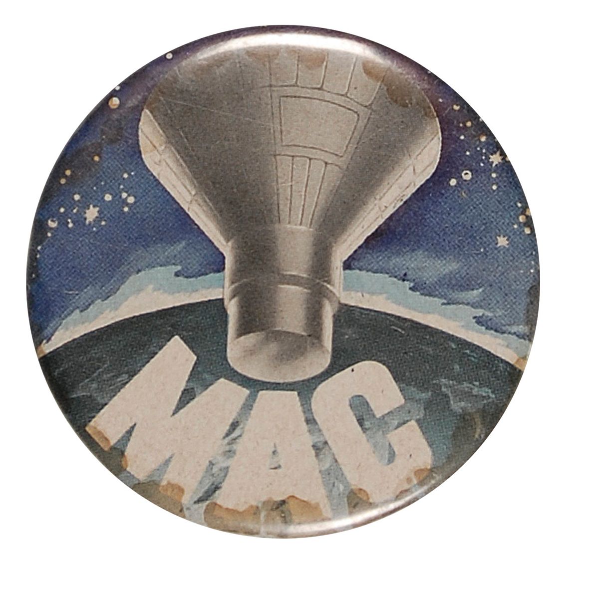 Original pinback “MAC” button, 2.5? in diameter. Pin features a space capsule in orbit, with “MAC” along the bottom edge, most likely standing for McDonnell Douglas. Scattered surface marks, light staining to edges, and expected age wear, otherwise fine condition.