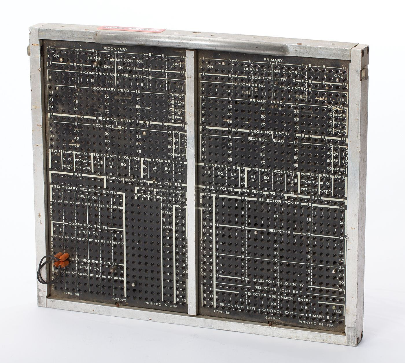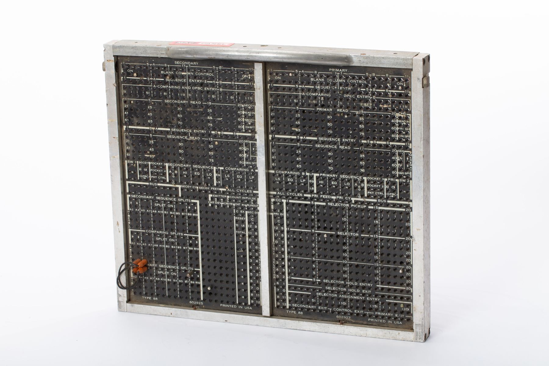 Vintage MAC Panel computer programming patch board in a metal frame, measuring 12.75˝ x 11˝ x 3˝, labeled with "Secondary" and "Primary" areas on both faces, with numerous multicolored jumper cables plugged into one side. Subsections are labeled: "Blank Column Control," "Sequence Entry," "Secondary Read," "Sequence Entry," "Sequence Splits," "Selector Pickup," and so on. In fine condition.