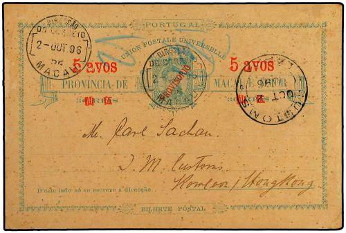1896 5 a. In red on 30 r. green stationery card, H & G 8, used to HM Customs, LAPPA cancelled MACAU cds and CUSTOMS-LAPPA cds in black. Rare and fine.
