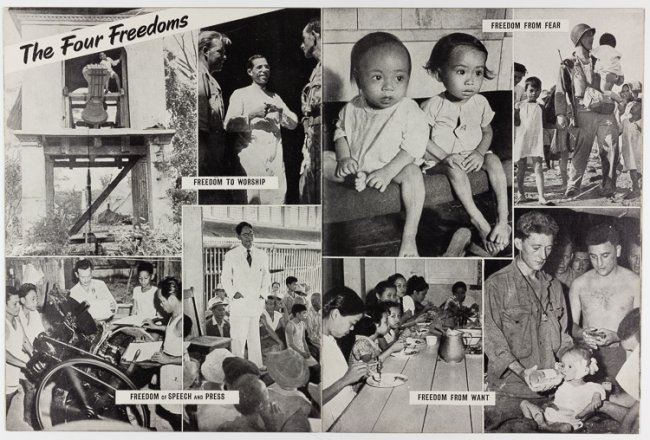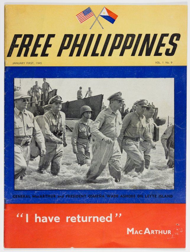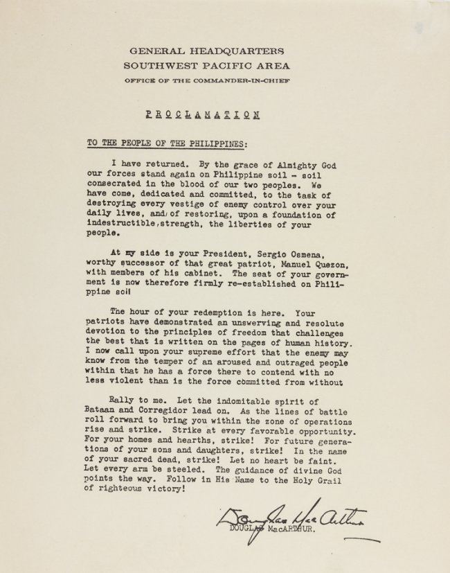 Lot of four items related to the liberation of the Philippines by American forces. Includes: printed flyer, 1p. 4to., a copy of Douglas MacArthur's types signed document to: "THE PEOPLE OF THE PHILIPPINES" declaring: "I have returned. By the grace of Almighty God our forces stand again on Philippine soil...The hour of your redemption is here...Rally to me..."; two similar flyers each 1p. 4to., issued in the field by Philippine President Sergio Osmena telling citizens that Allied forces are advancing and that the people must now carry the fight to the enemy; and a Jan. 1, 1945 edition of "Free Philippines" showing MacArthur's landing on the cover with his famous quote, 34pp. 4to., a heavily-illustrated pro-American victory issue with messages from MacArthur, Osmena, F.D.R., and Carlos Romulo. Chip to back cover.