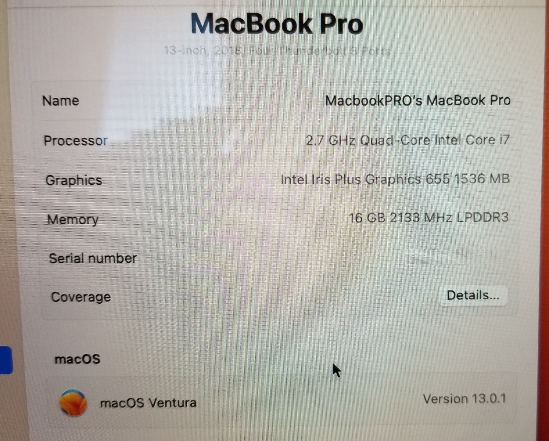 16GB/1 TB SSD.RETAIL WAS $3600.RETINA INTEL IRIS PLUS GRAPHICS 655, 58 BATTERY CYCLE COUNT, MAC OSX VENTURA, MS OFFICE PRO 2021, MANUFACTURE DATE 10-09-2018. ORIGINAL BOX AND CHARGER INCLUDED. NEAR PERFECT CONDITION.