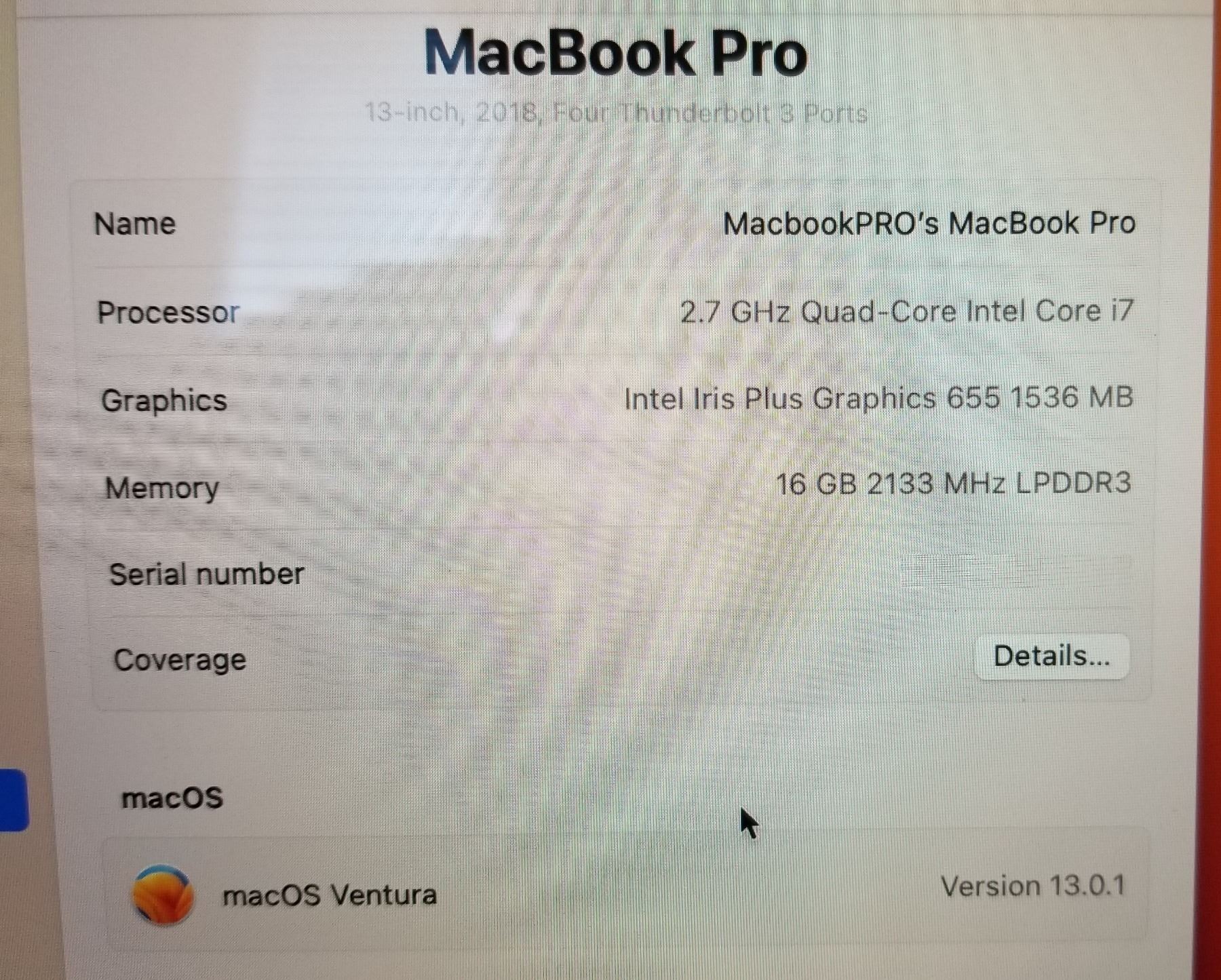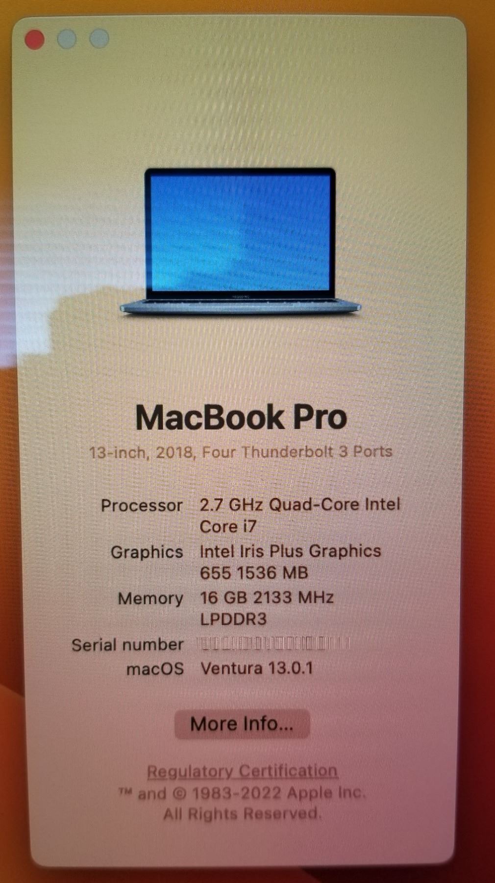 16GB/1 TB SSD.RETAIL WAS $3600.RETINA INTEL IRIS PLUS GRAPHICS 655, 58 BATTERY CYCLE COUNT, MAC OSX VENTURA, MS OFFICE PRO 2021, MANUFACTURE DATE 10-09-2018. ORIGINAL BOX AND CHARGER INCLUDED. NEAR PERFECT CONDITION. **ALL ITEMS MUST BE REMOVED BY 5PM SATURDAY, FEBRUARY 4TH 2023.** ALL REMAINING ITEMS WILL BE SUBJECT TO A $6.00 PER DAY STORAGE CHARGE. ANY ITEMS REMAINING AFTER MONDAY, FEBRUARY 20TH, 2023 WILL BE CONSIDERED FORFEITED. NO REFUNDS WILL BE ISSUED FOR FORFEITED ITEMS. TO SCHEDULE A PICK UP APPOINTMENT CLICK HERE