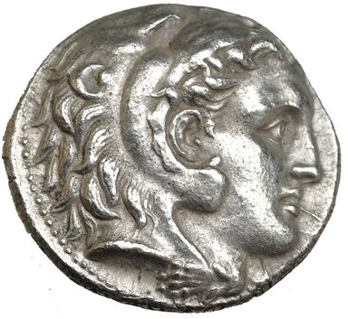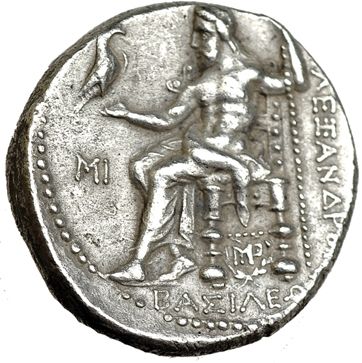 MACEDONIA. Alejandro III. Tetradracma. Babilonia (311-305 a.C.). R/ Zeus sentado a izq. con águila y cetro, delante MI y bajo el trono monograma dentro de corona. AR 17,0 g. PRC-3751a. EBC-.